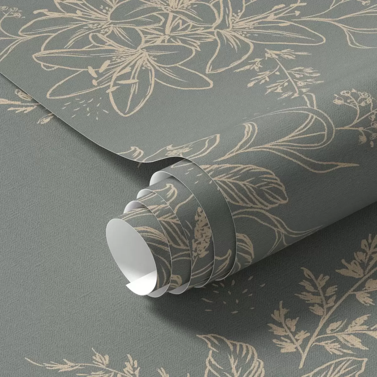 Tapet Konturblommor på blågrå bakgrund, elegant botaniskt mönster Nr. a00226