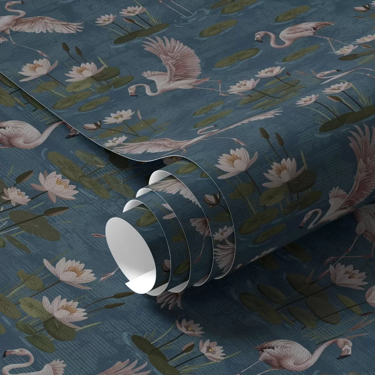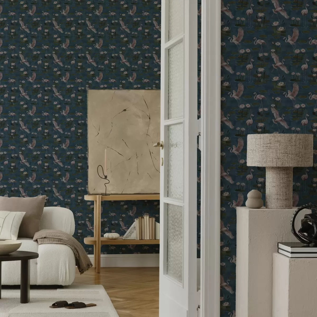 Tapet Flamingo bland näckrosor, tropisk scen på marinblå bakgrund Nr. a00237