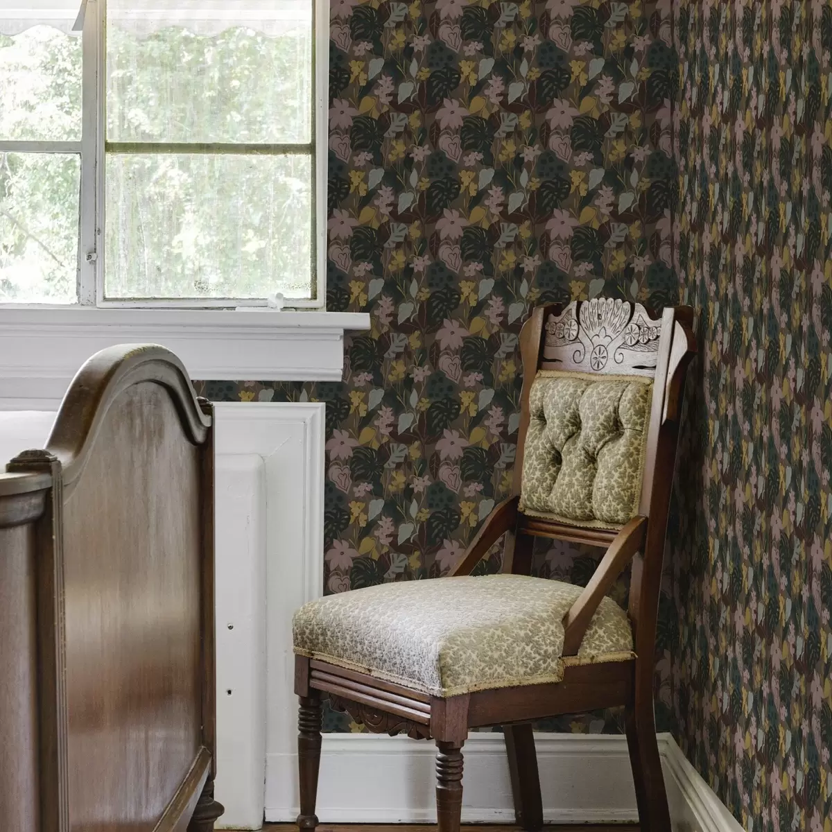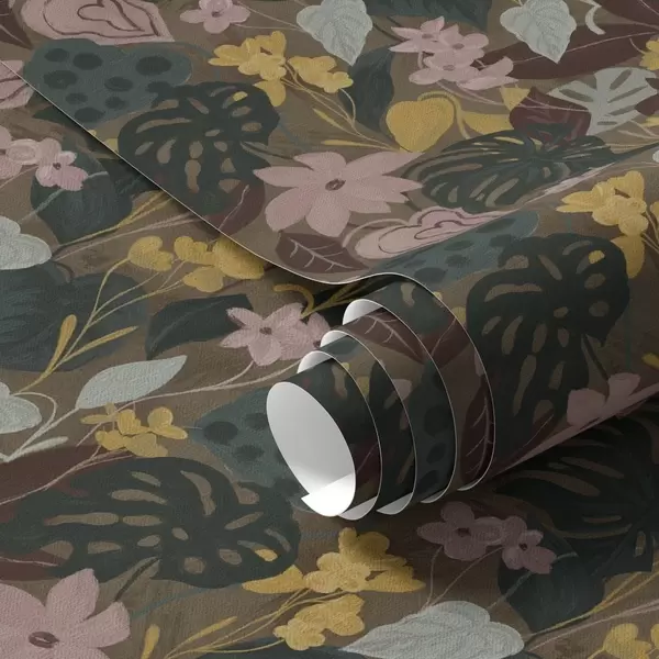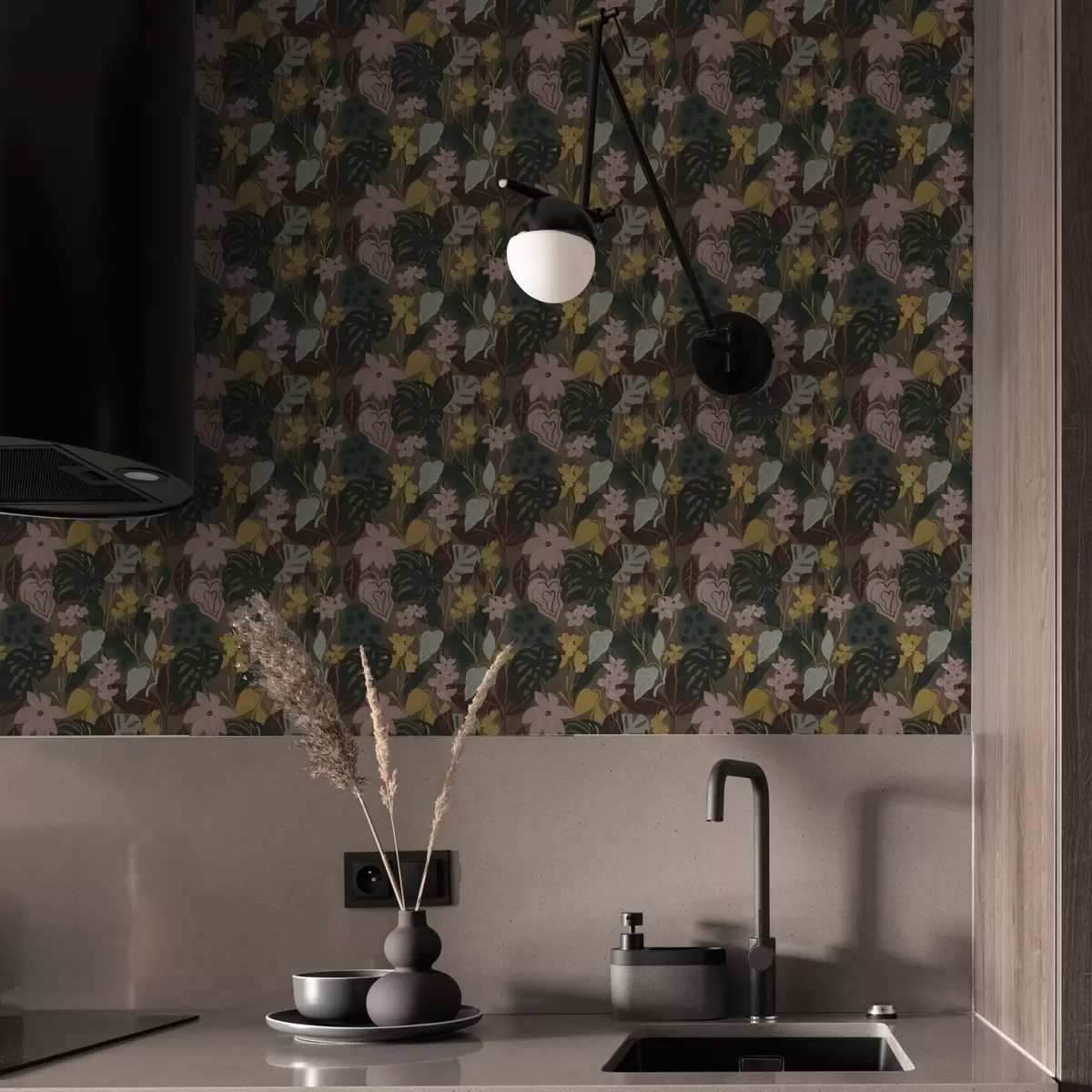 Tapet Mörka tropiska blad och blommor i en tät målning tät målning Nr. a00244