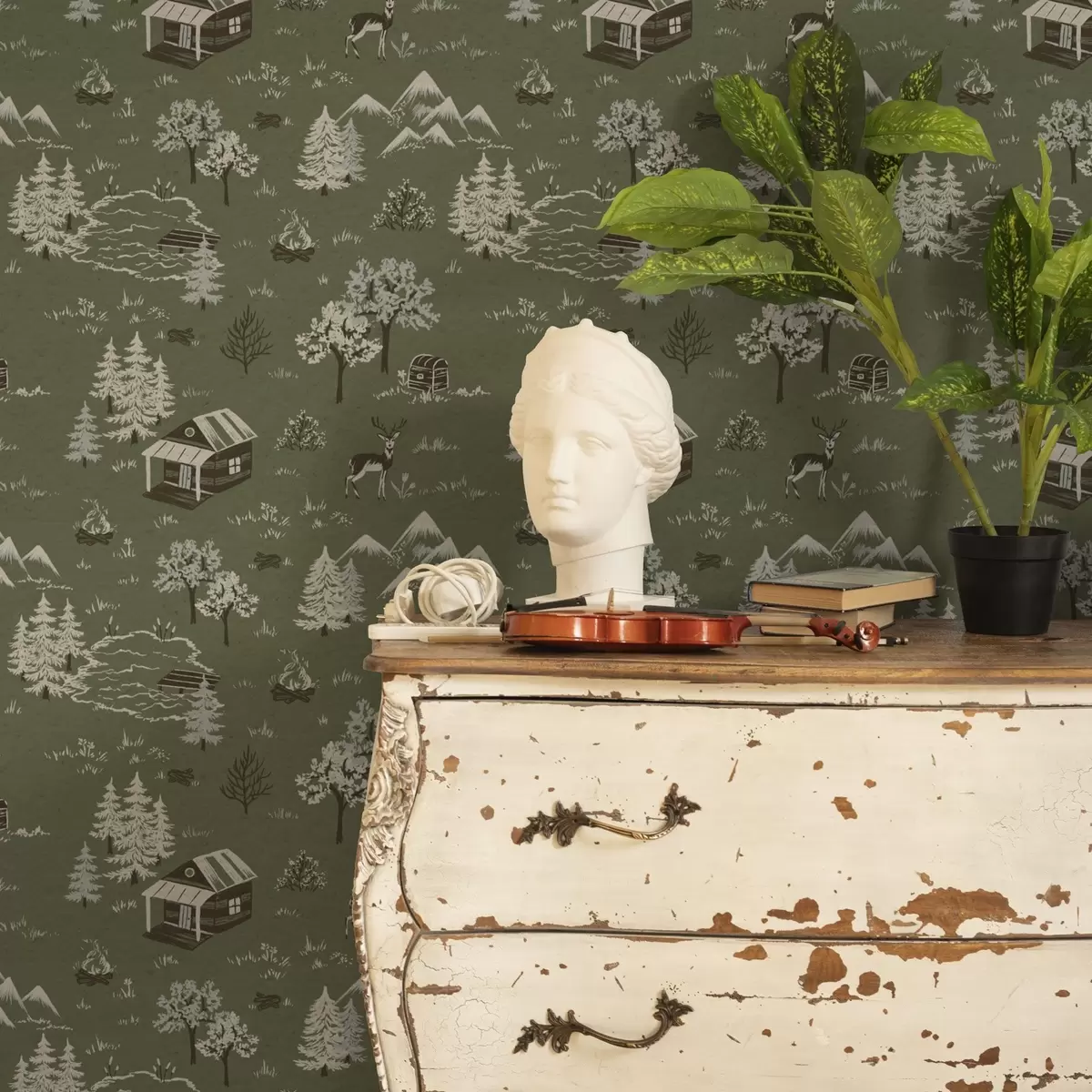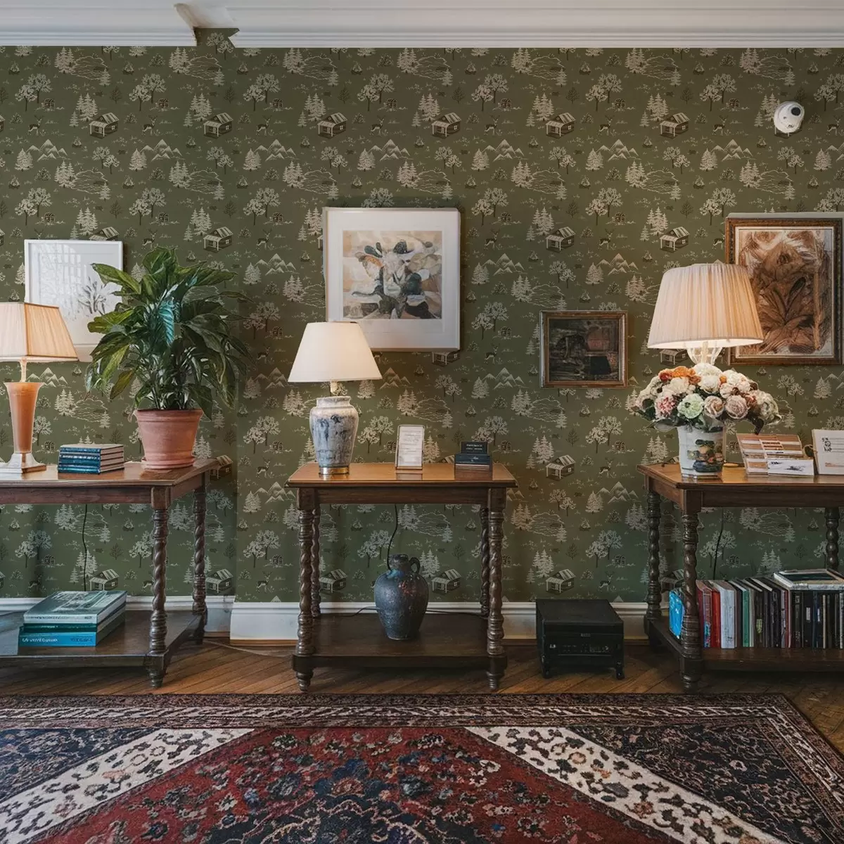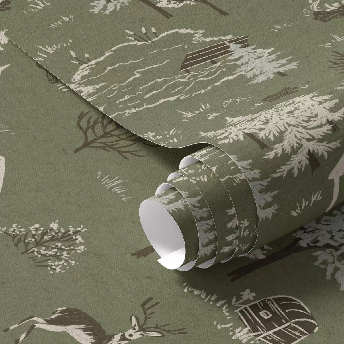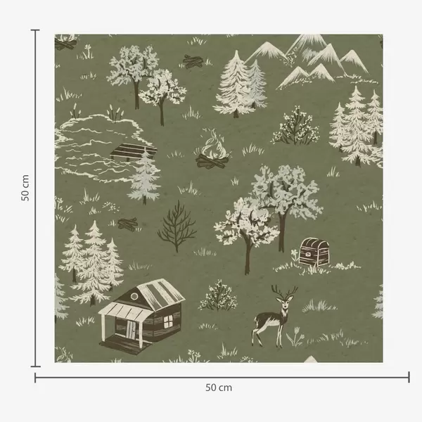 Tapet Målad skog med sjö, stuga och djur Nr. a00267