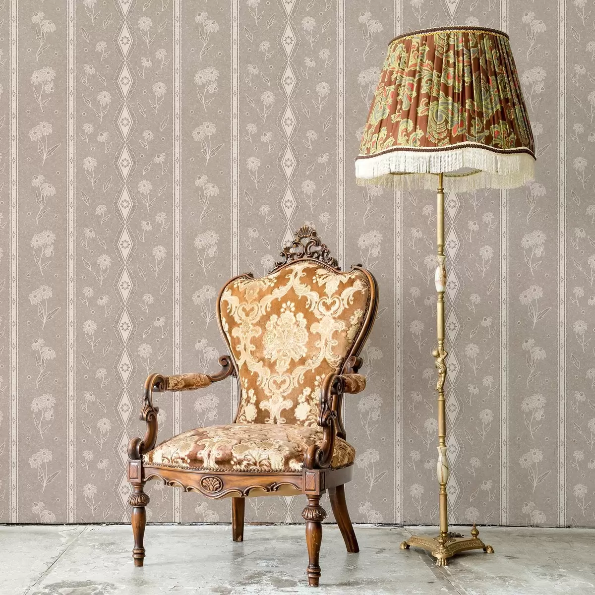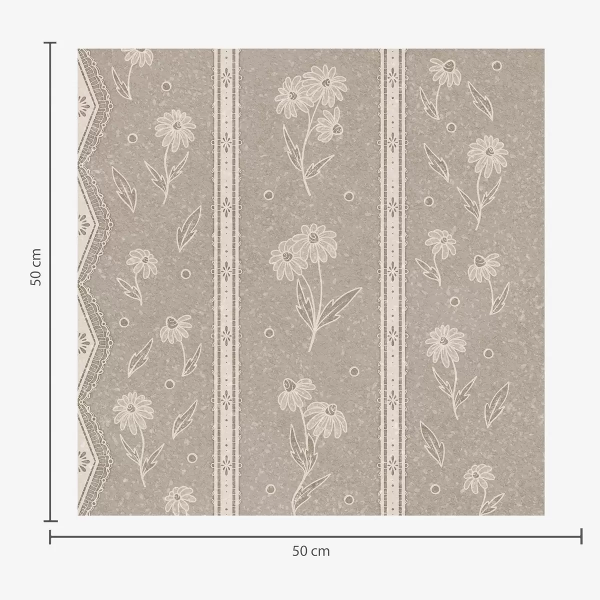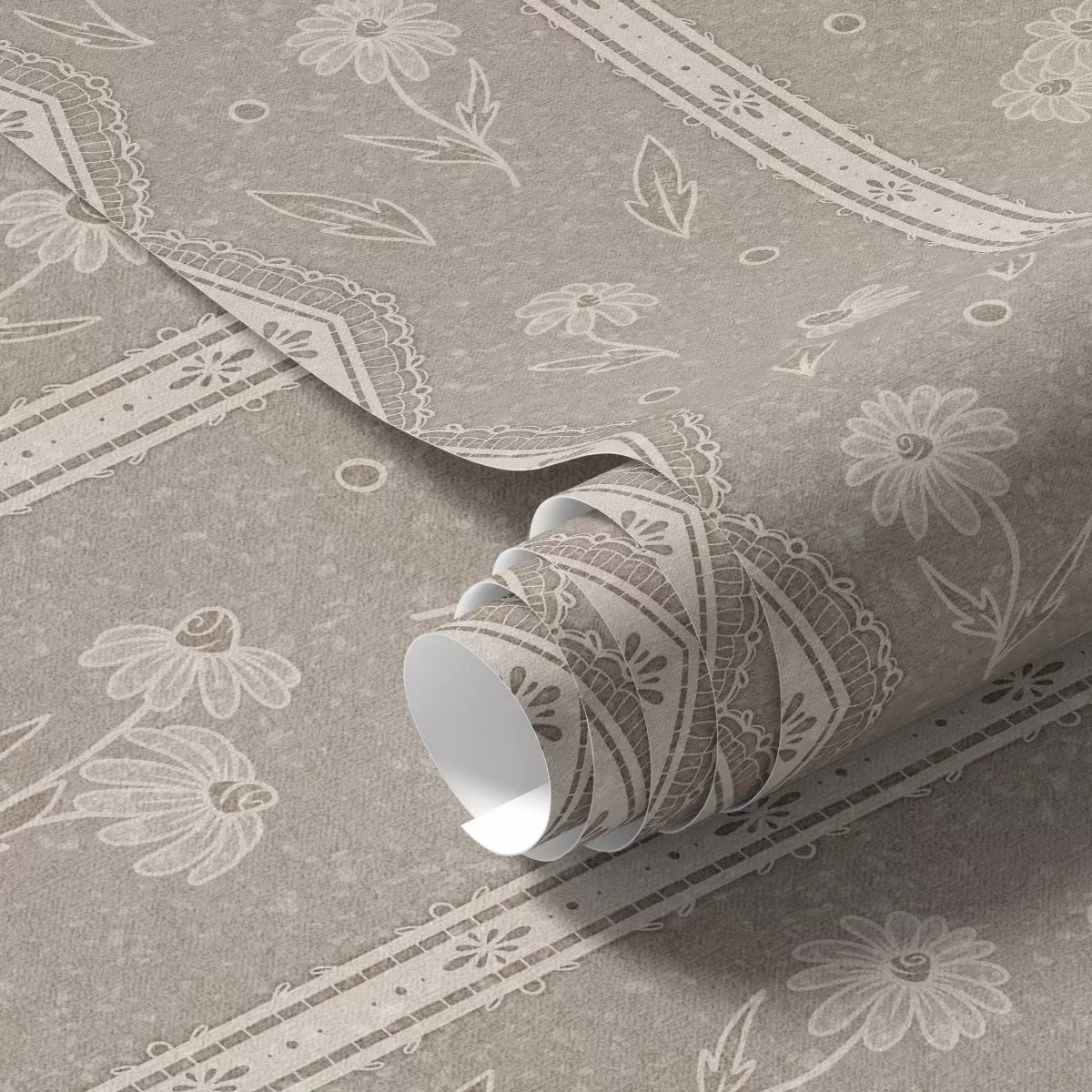 Tapet Ränder med prästkragar och spetsar på en grå-beige bakgrund Nr. a00295