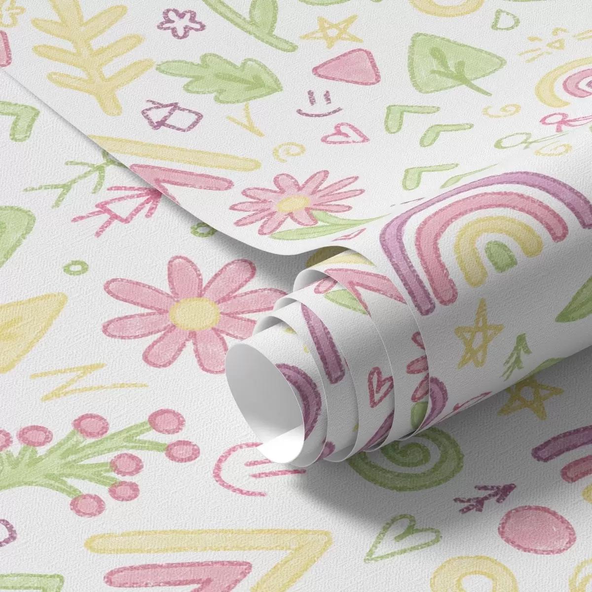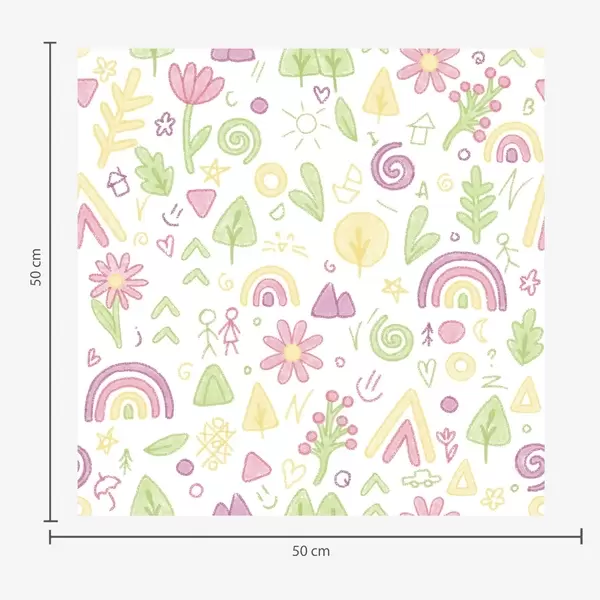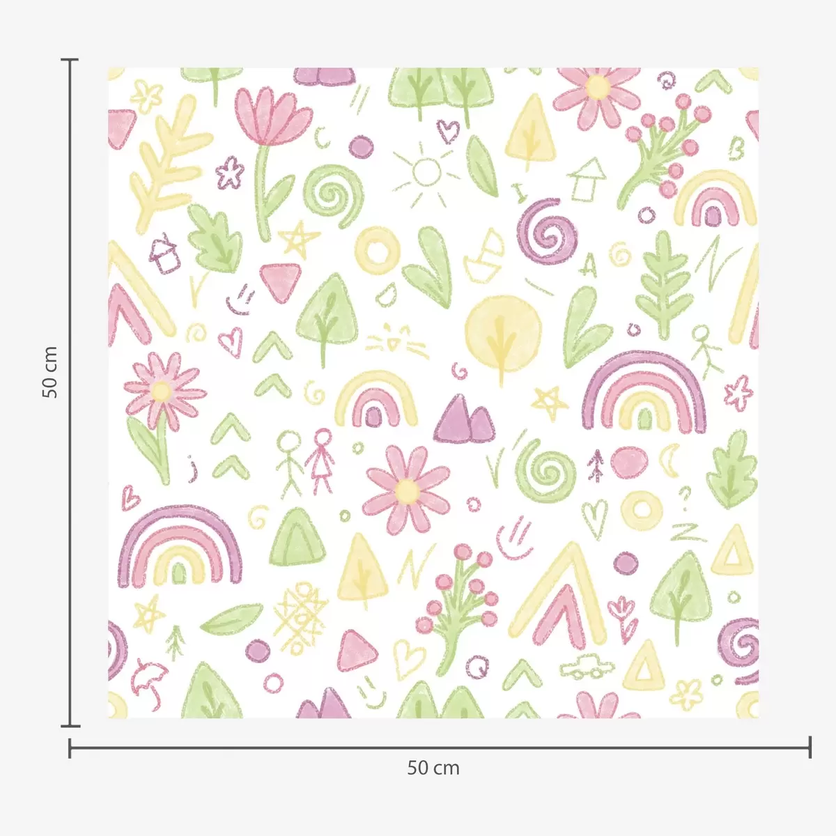 Tapet Barnteckning med regnbågar, blommor och träd Nr. a00296