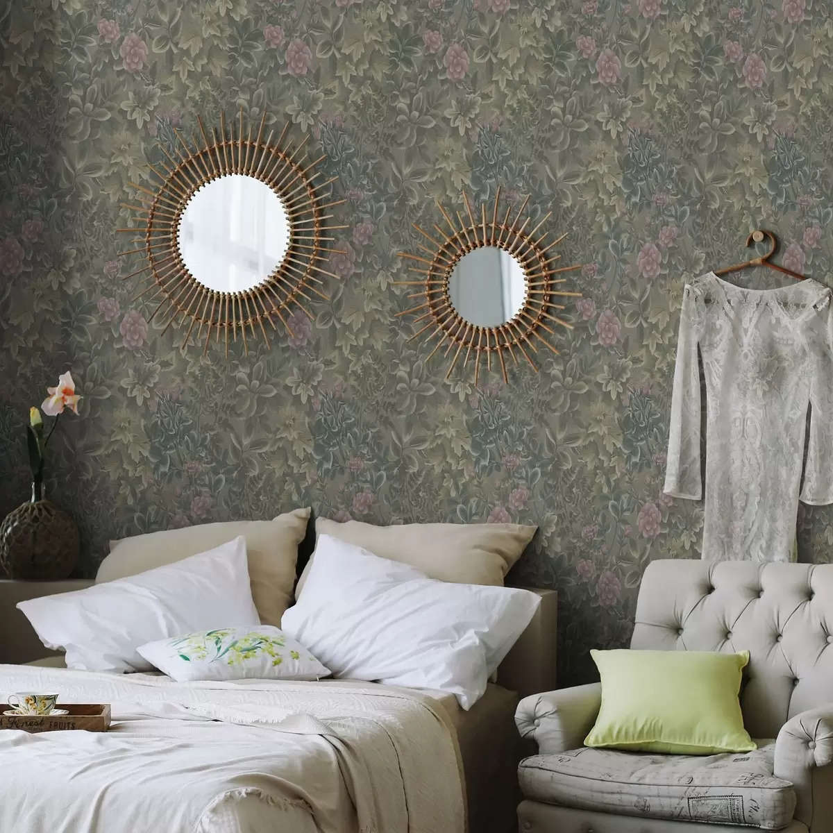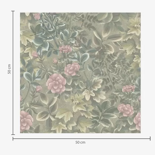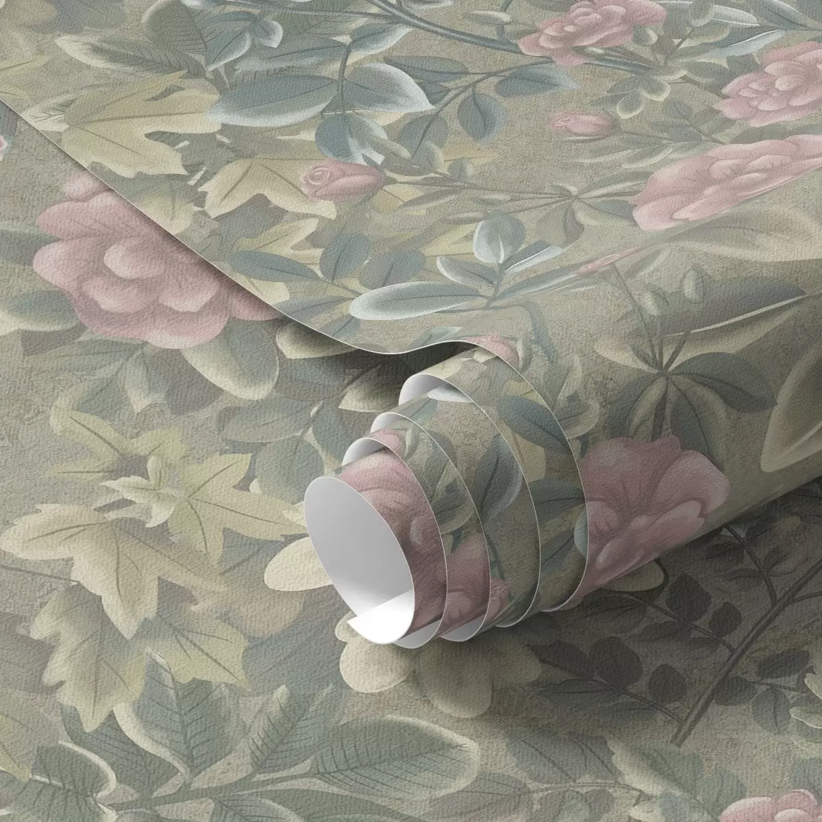 Tapet Rosa blommor och blad på en pastellgrön bakgrund Nr. a00306