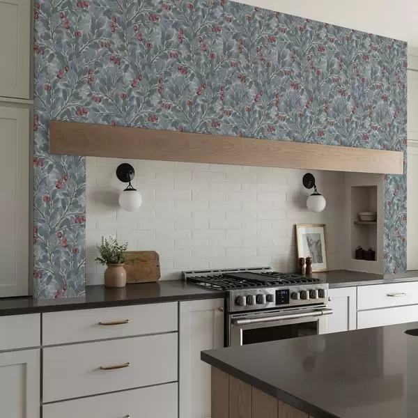 Tapet Blå blad med kvistar av röda bär Nr. a00309