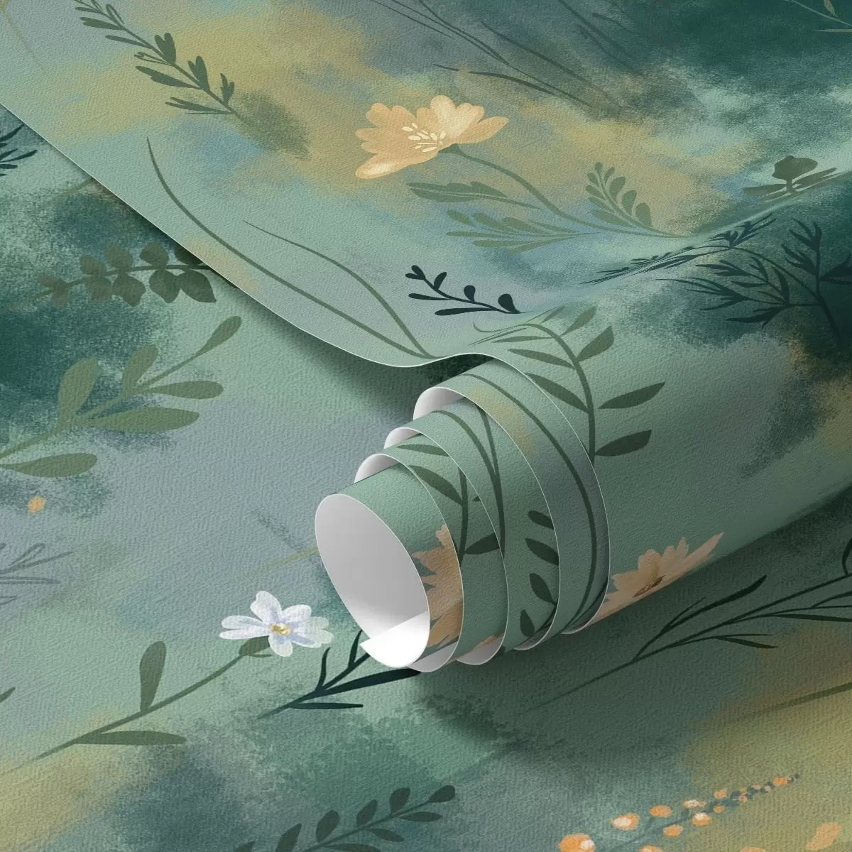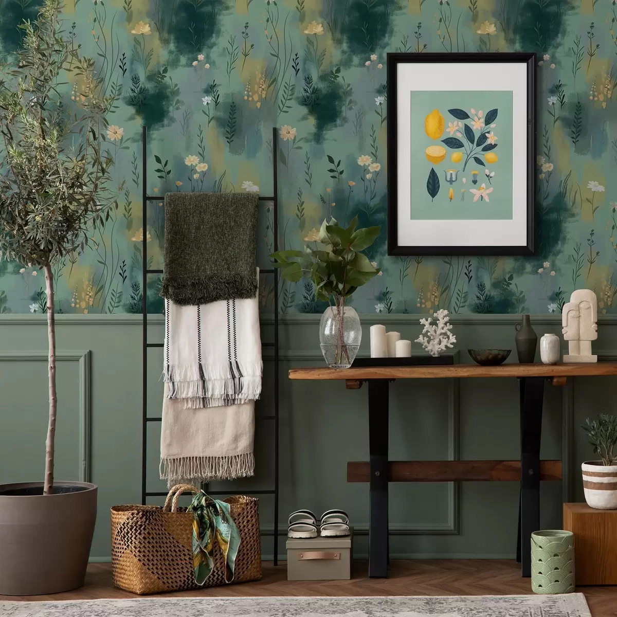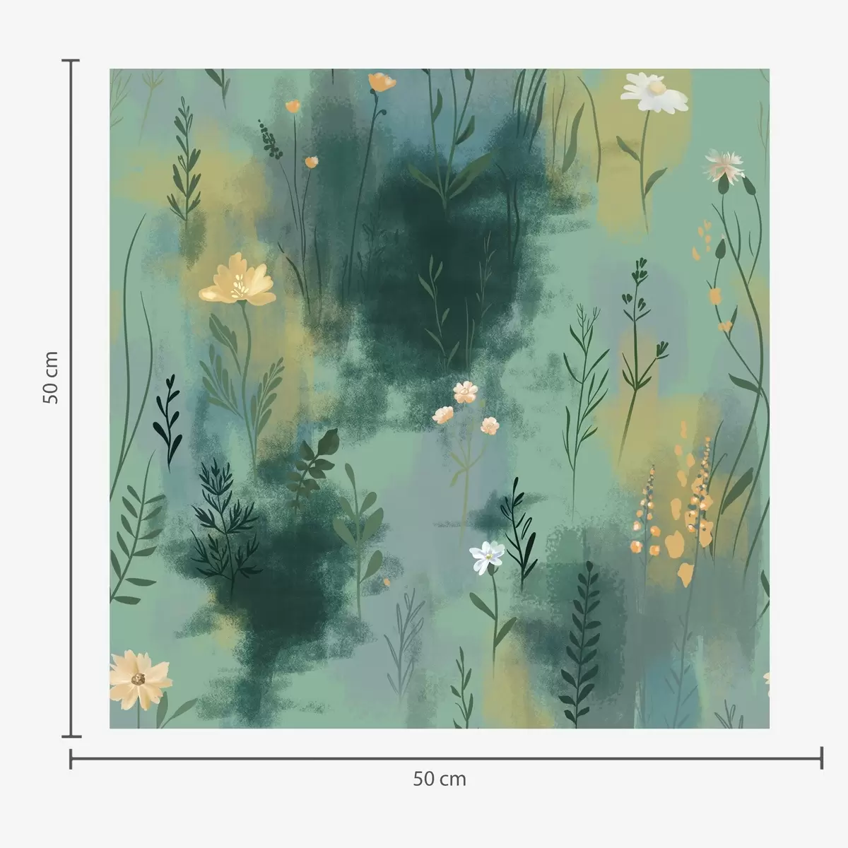 Tapet Akvarellabstraktion med blommor på grön bakgrund Nr. a00312