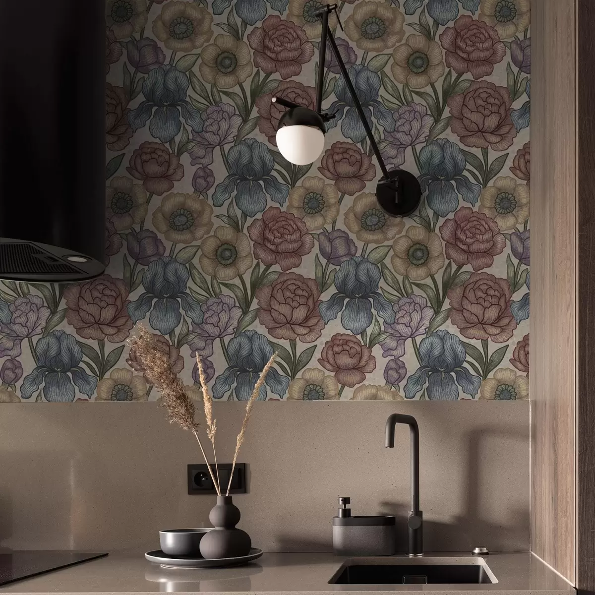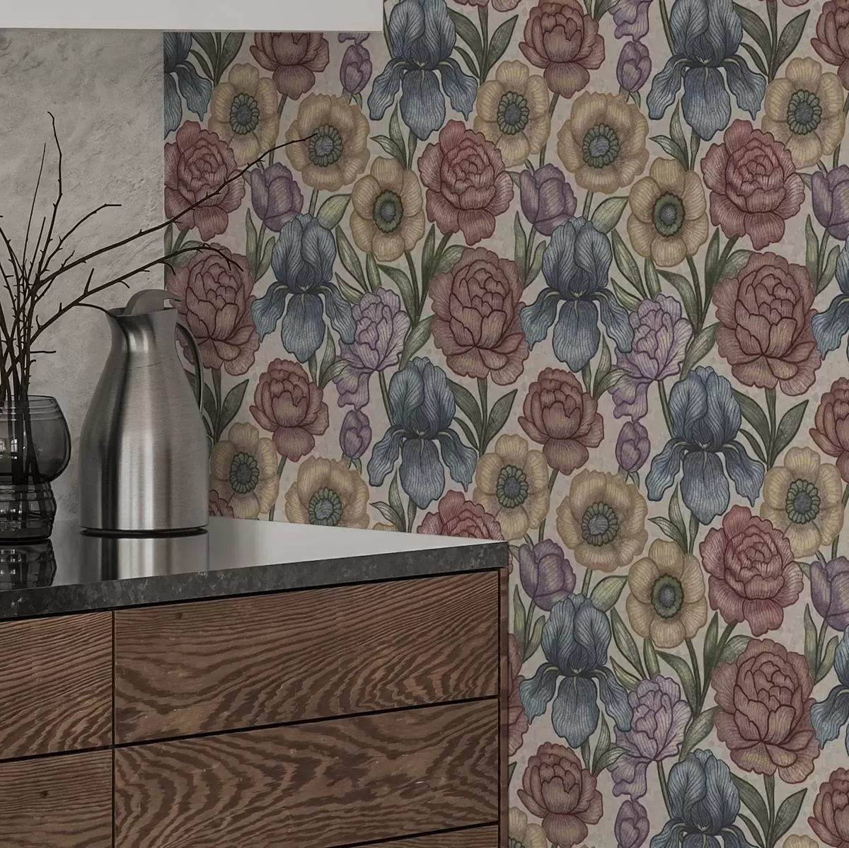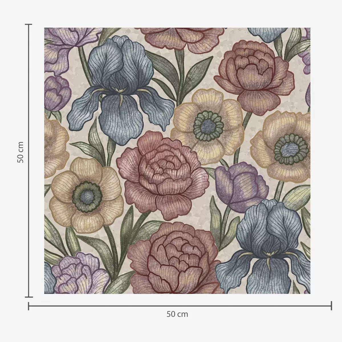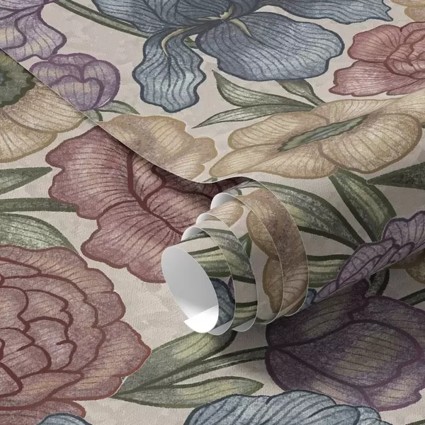 Tapet Stora blomsterillustrationer med irisar och pioner Nr. a00325