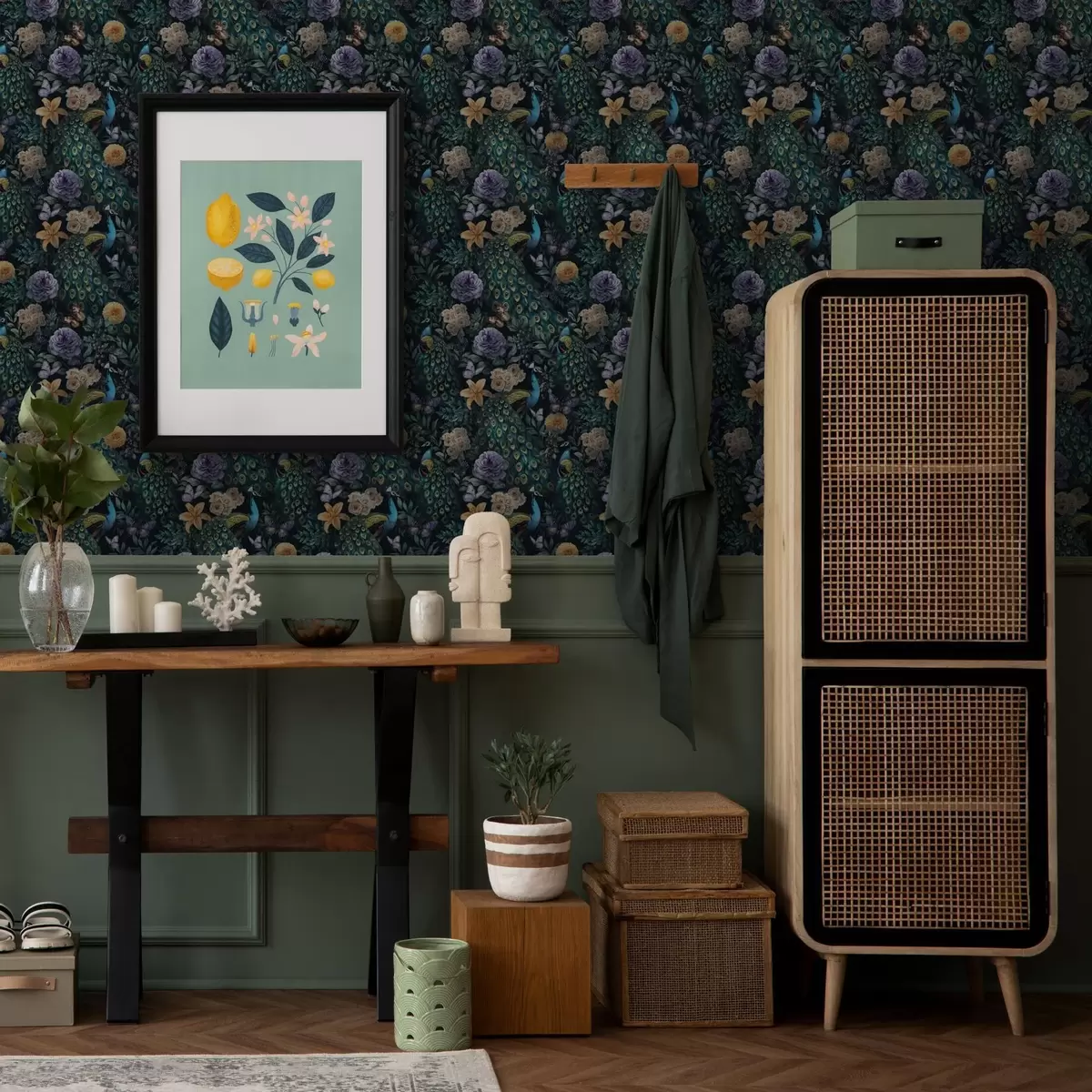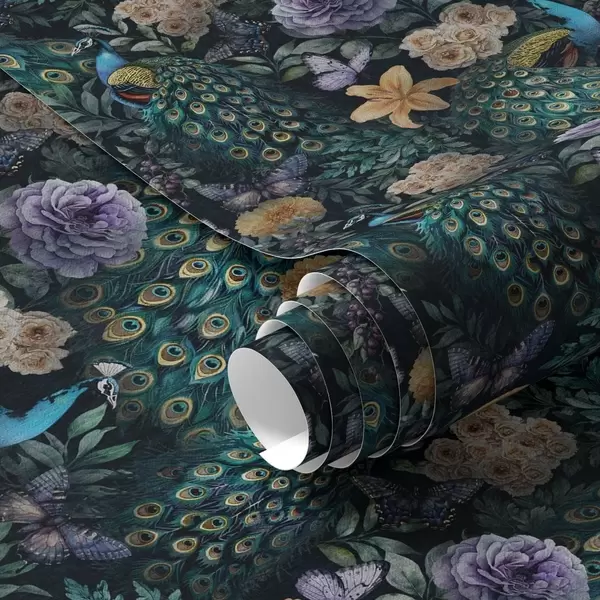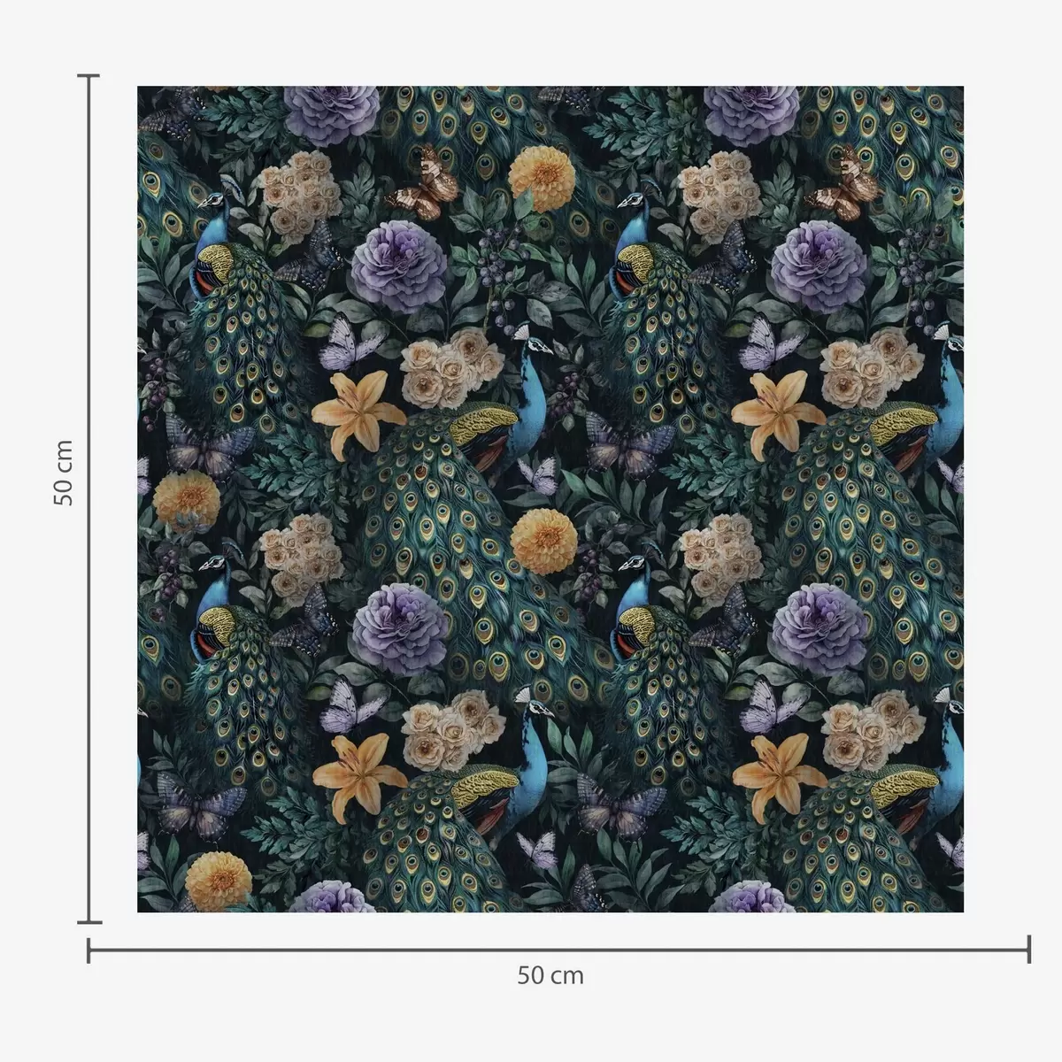Tapet Påfåglar bland mörka blommor och fjärilar Nr. a00348