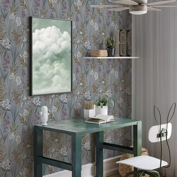 Tapet Blommiga grenar på en blågrå bakgrund Nr. a00350