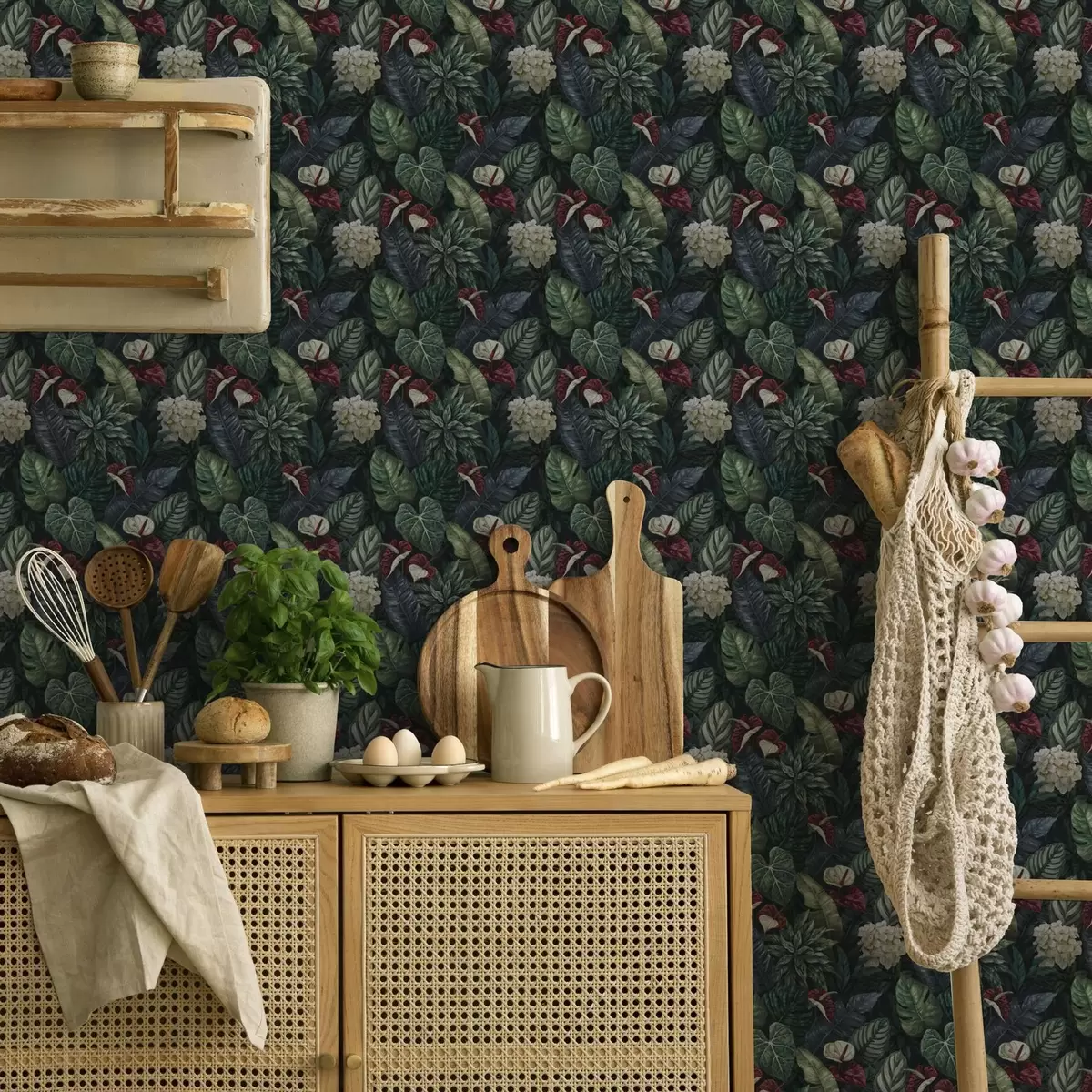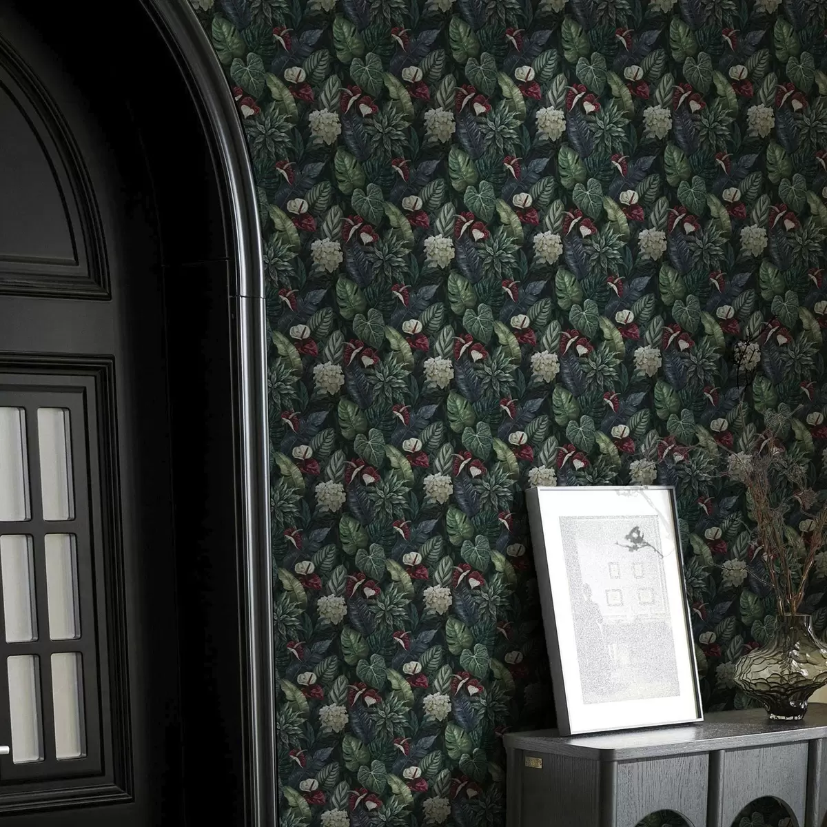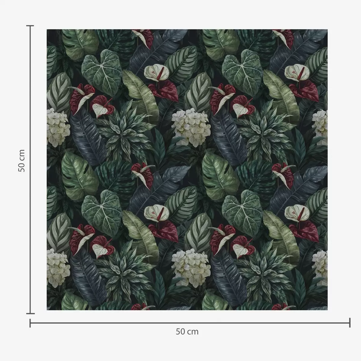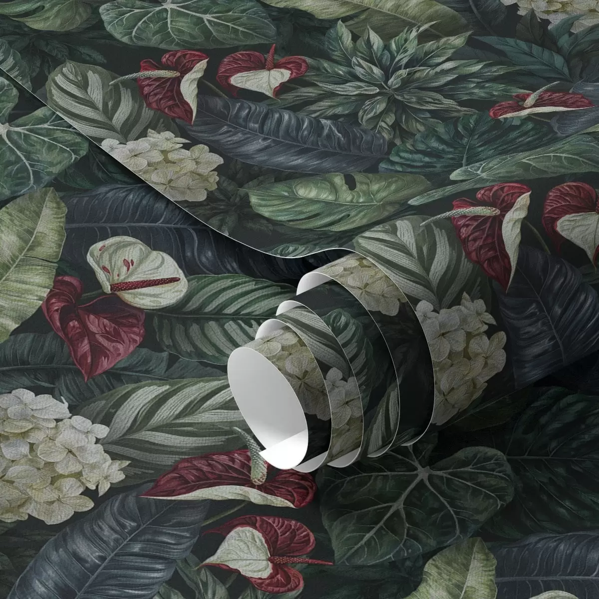 Tapet Tropiska blad med vita och röda blommor Nr. a00361