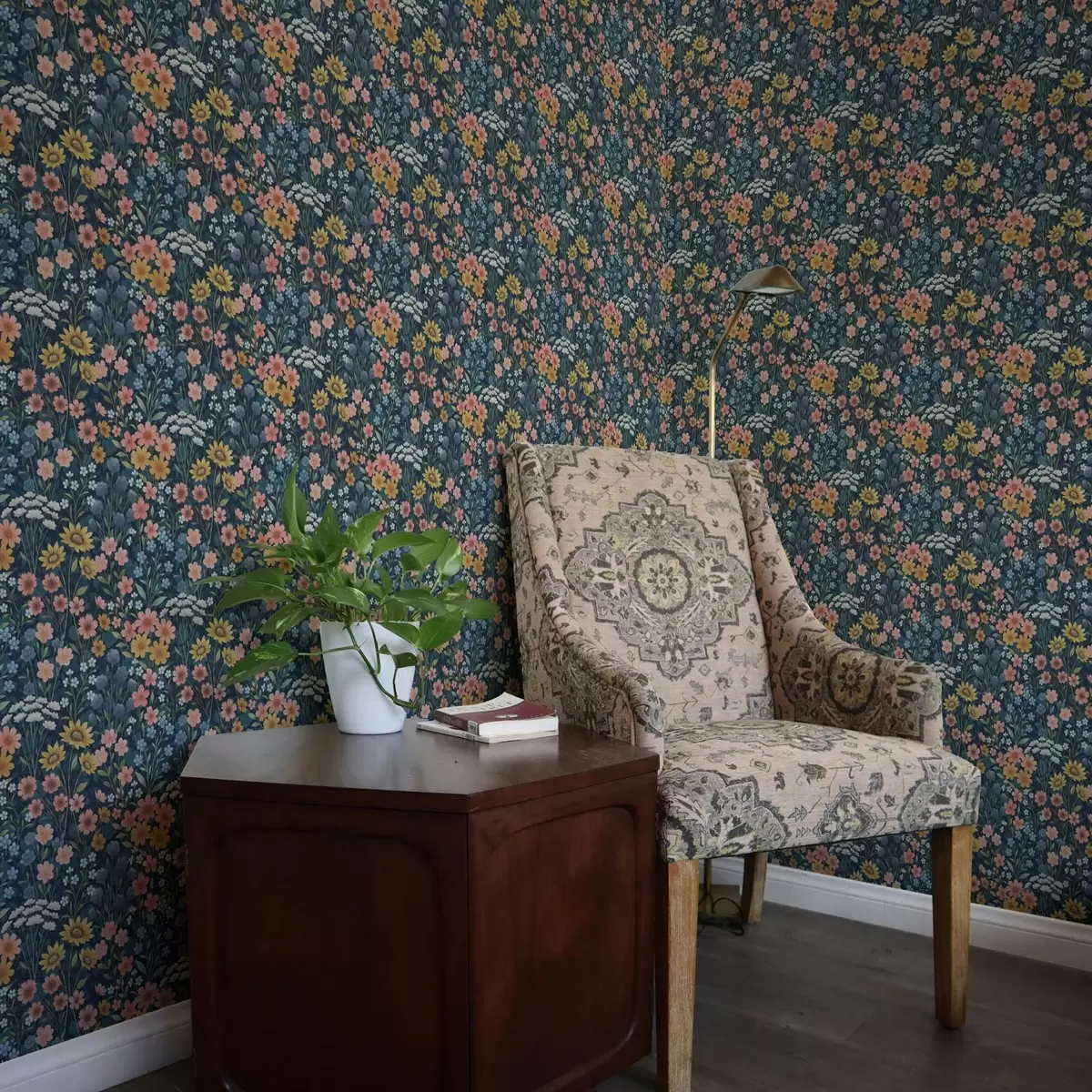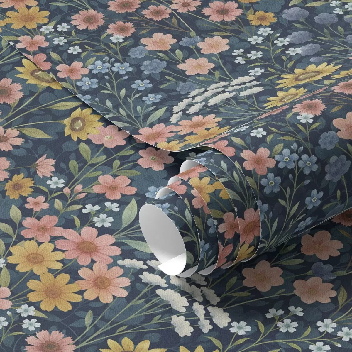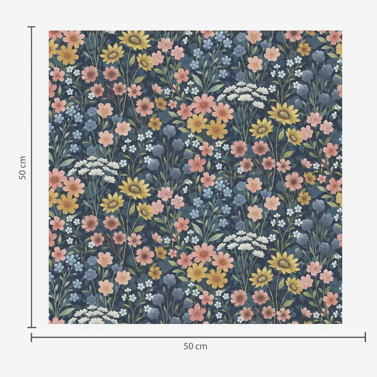 Tapet Färgglada vattenfärgade ängsblommor på marinblå botten Nr. a00381