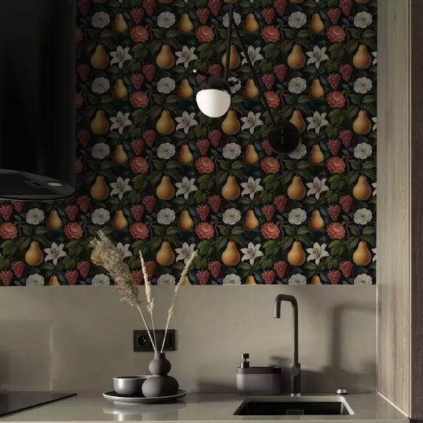 Tapet Barocka frukter och blommor på en dramatisk mörk bakgrund Nr. a00387