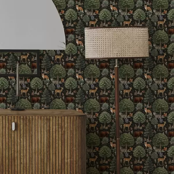 Tapet Skogsdjur i akvarell med träd och svampar Nr. a00391