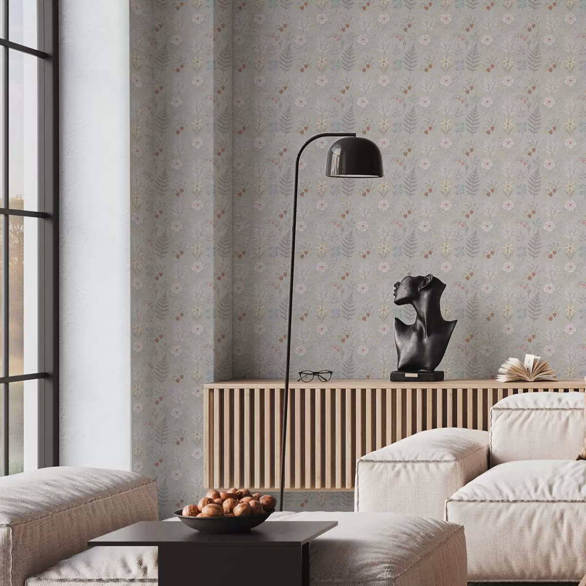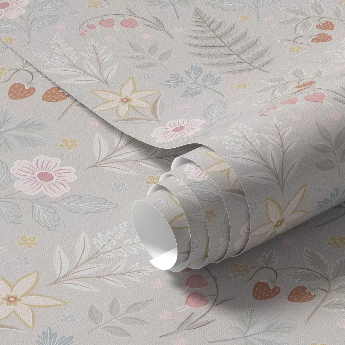 Tapet Pastellfärgade blommor och bär på en ljusgrå bakgrund Nr. a00406