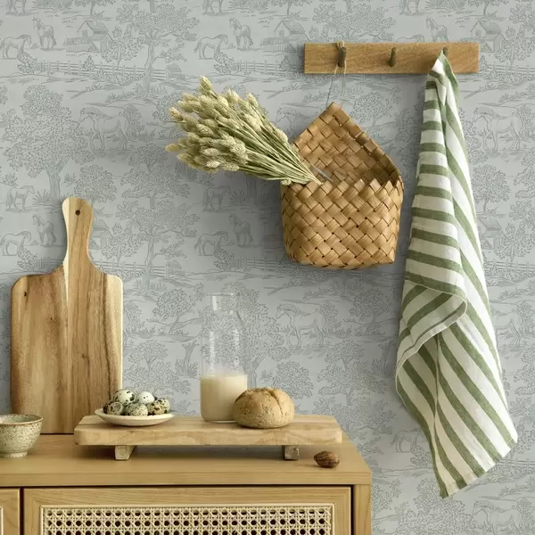 Tapet Grönt monokromt landskap med hästar och stugor Nr. a00407
