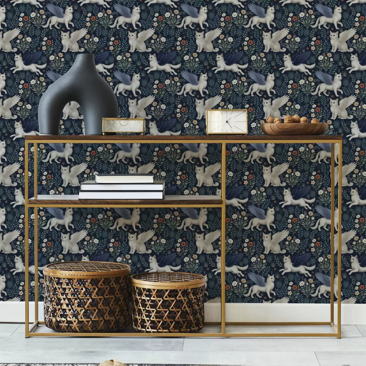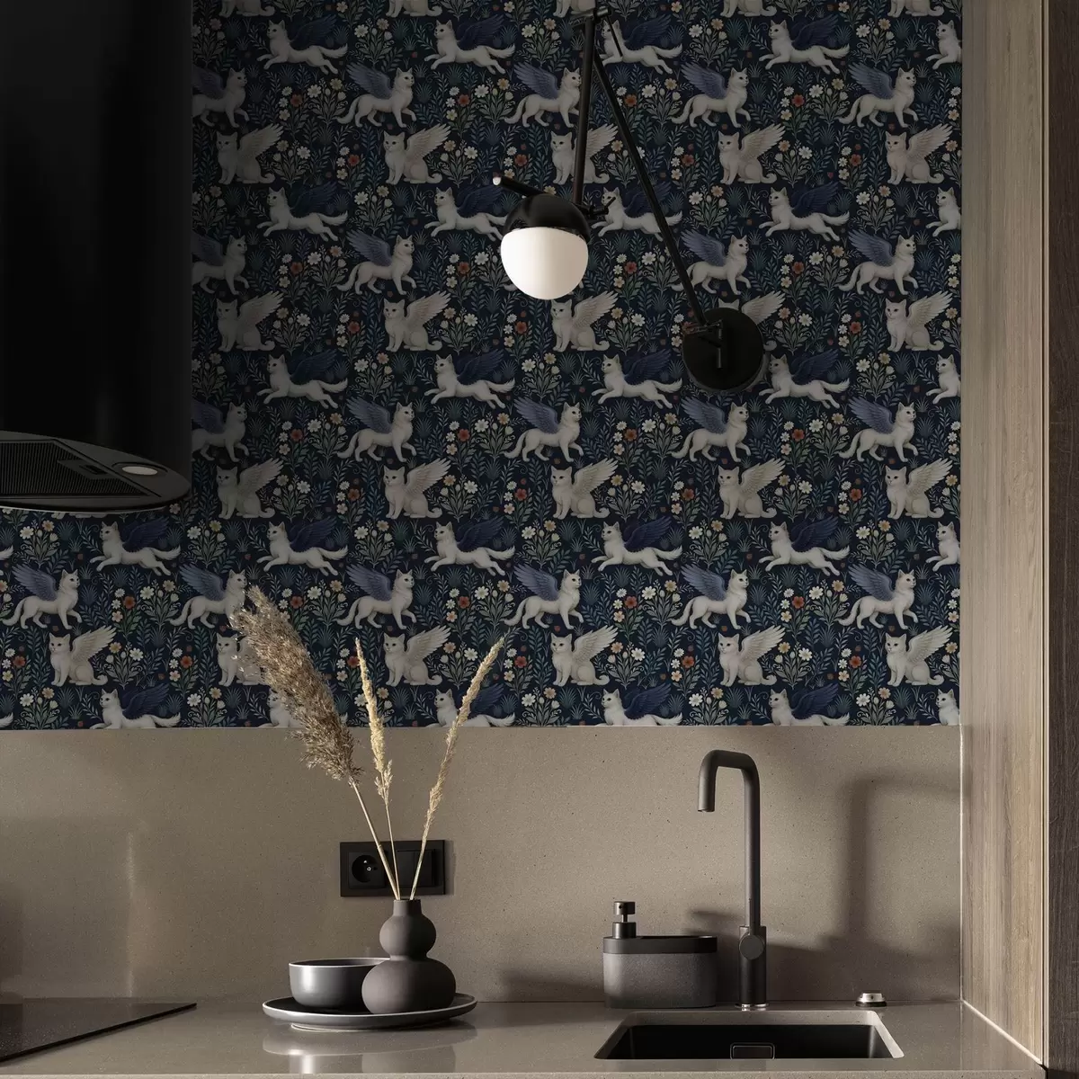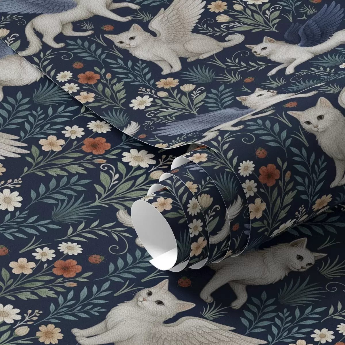 Tapet Fantasikatter med vingar bland blommor Nr. a00408