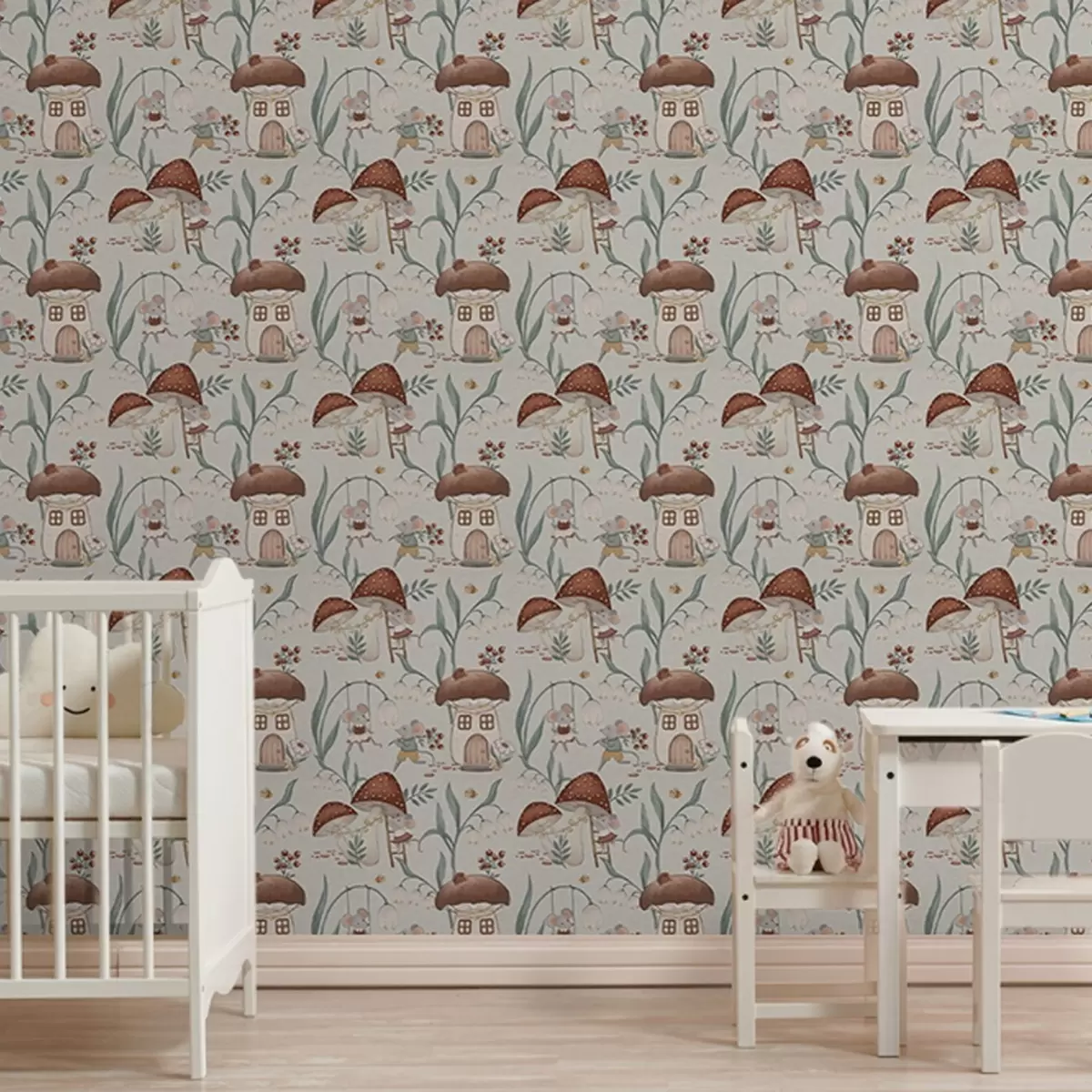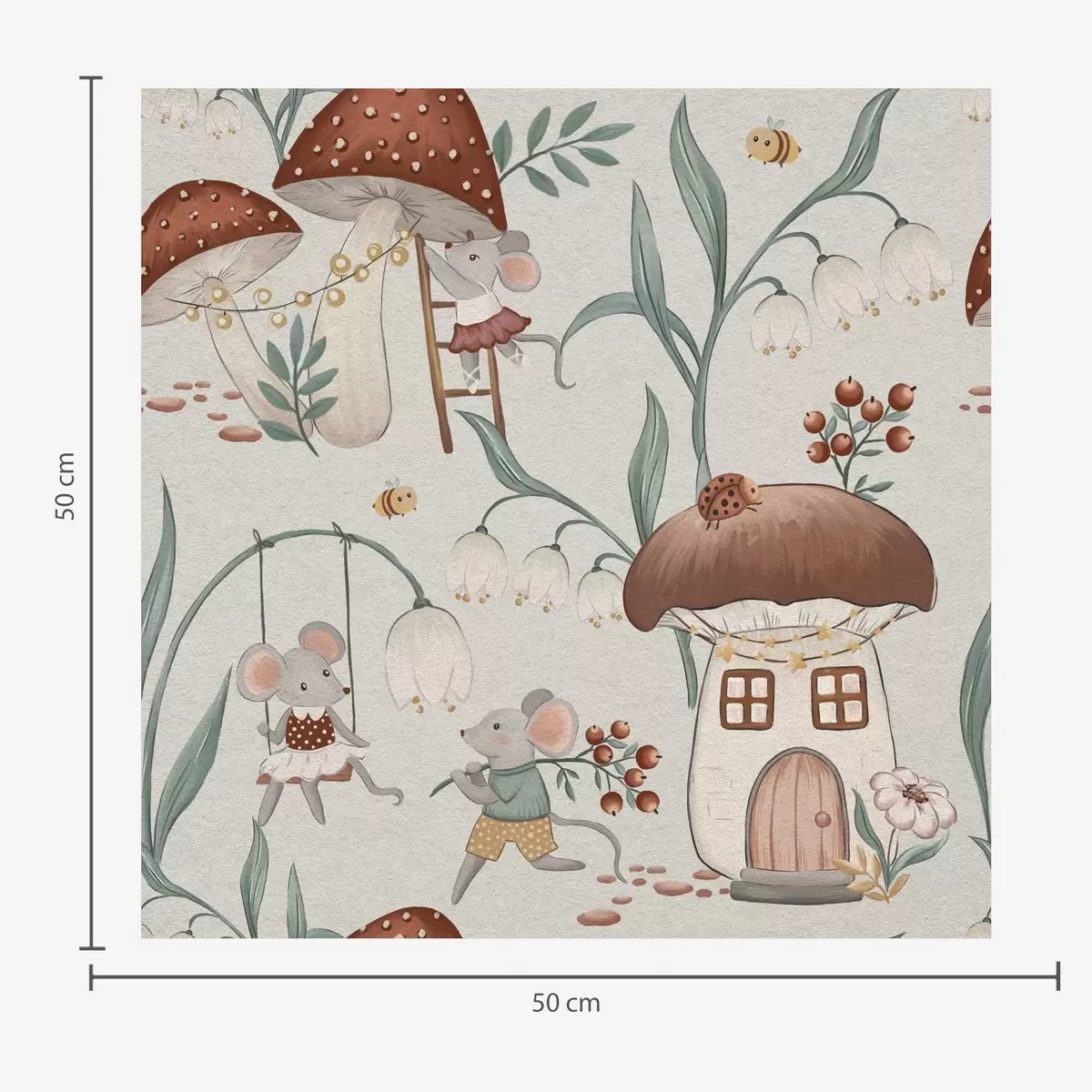 Tapet Söta möss och svampar mot bakgrund av ett tjusigt skogslandskap Nr. a00450