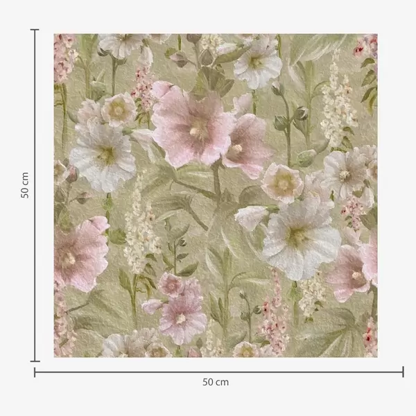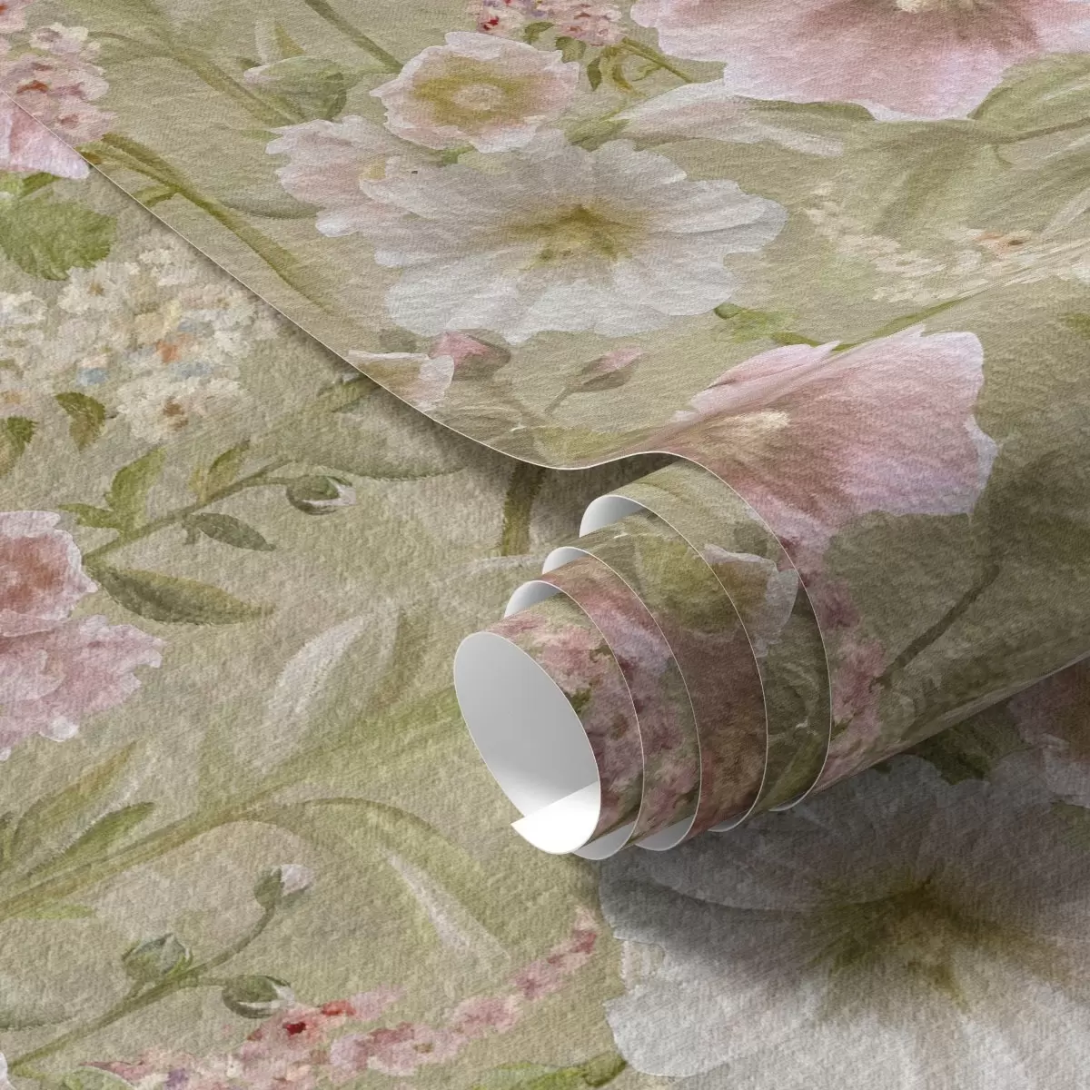 Tapet Romantiska rosa och vita stockrosor på dämpad grönska Nr. a00456