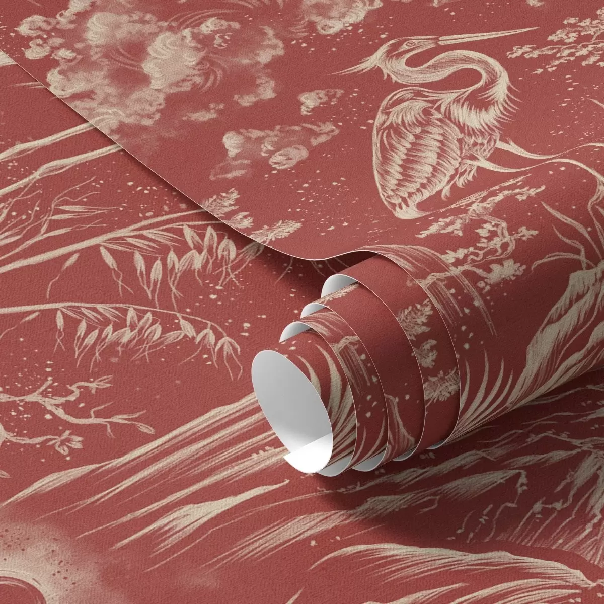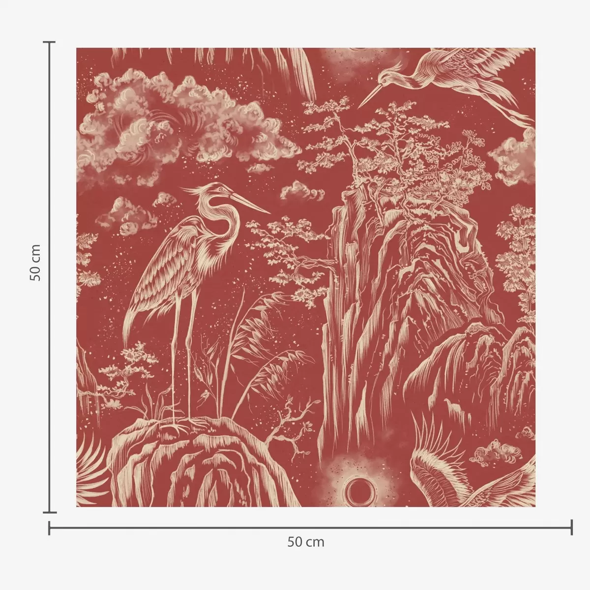 Tapet Hägrar, berg och moln i stil med japansk gravyr Nr. a00458