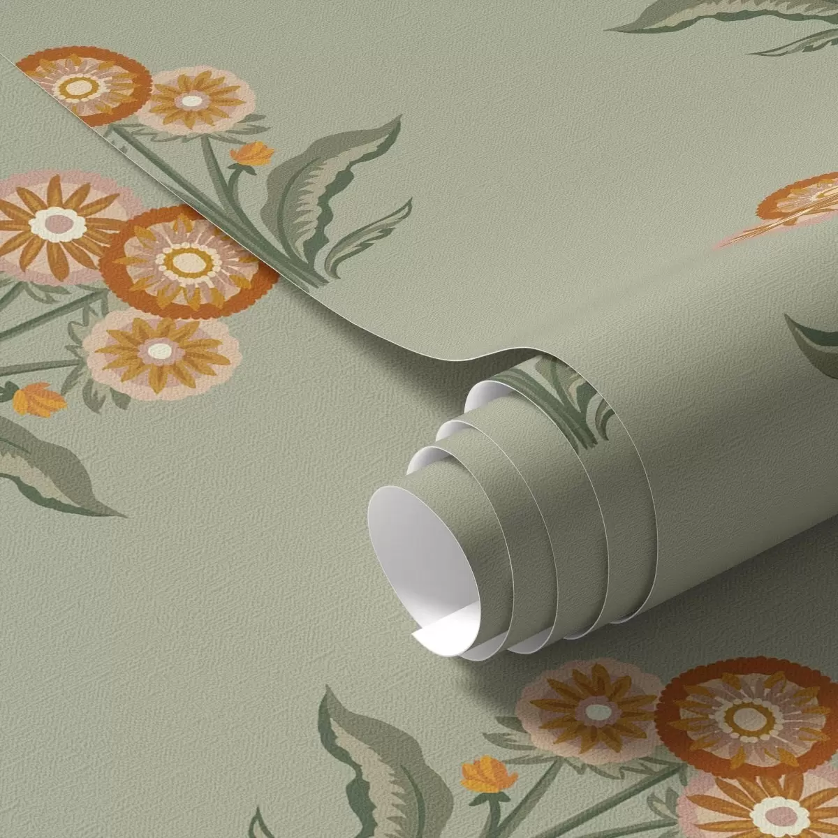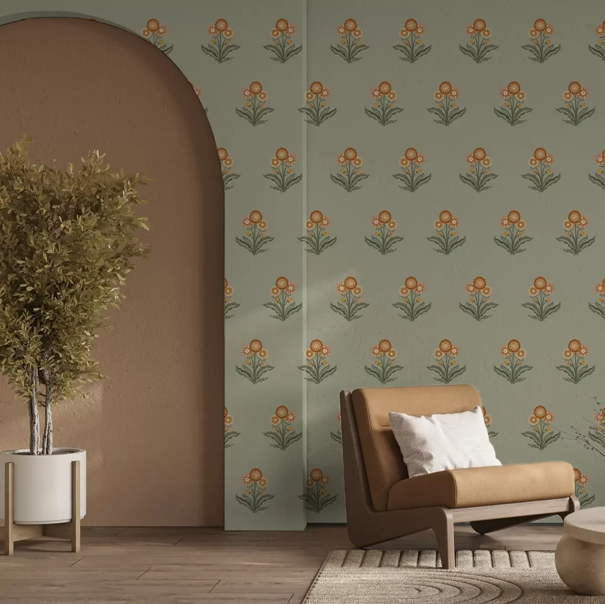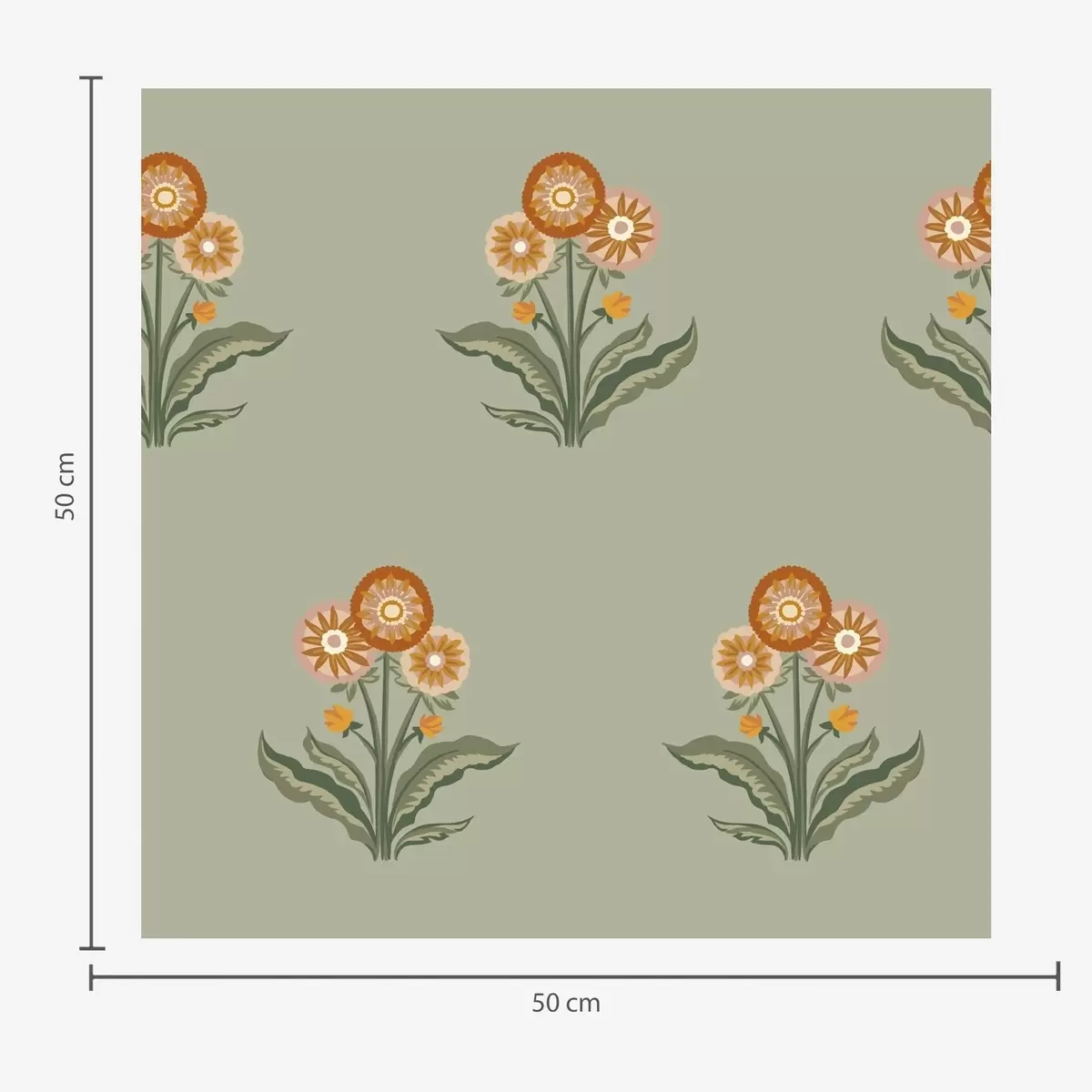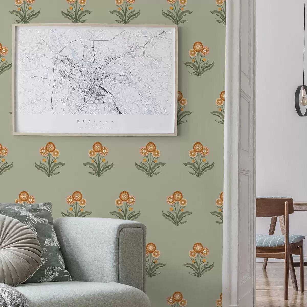 Tapet Stiliserade blommor på olivgrön bakgrund, varma toner Nr. a00494v2
