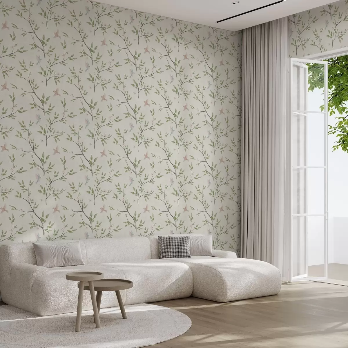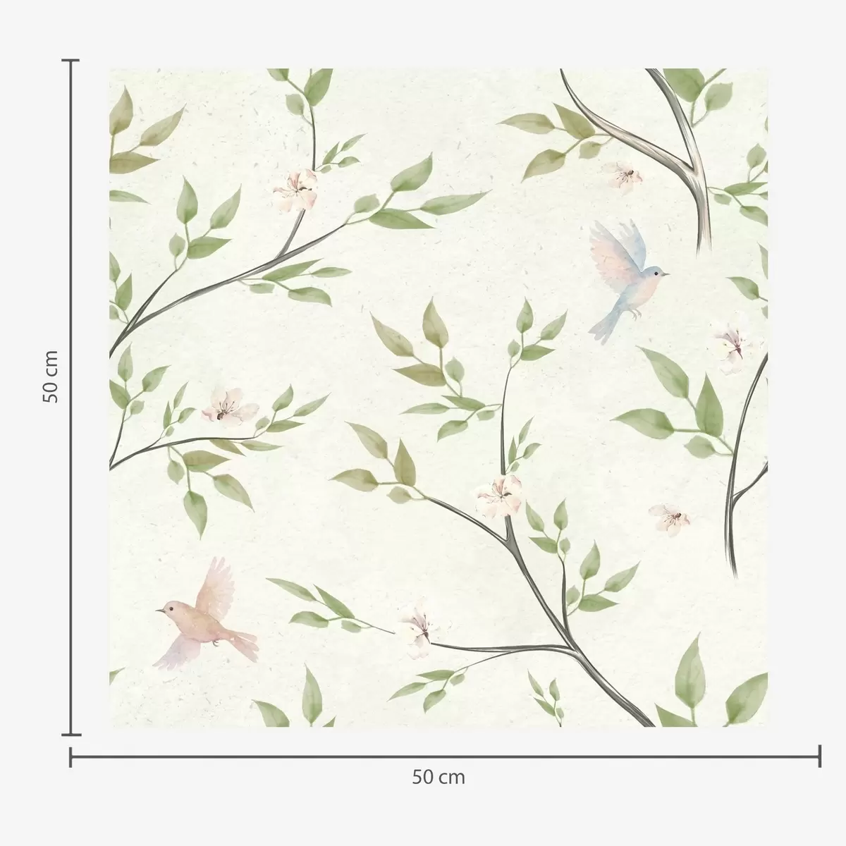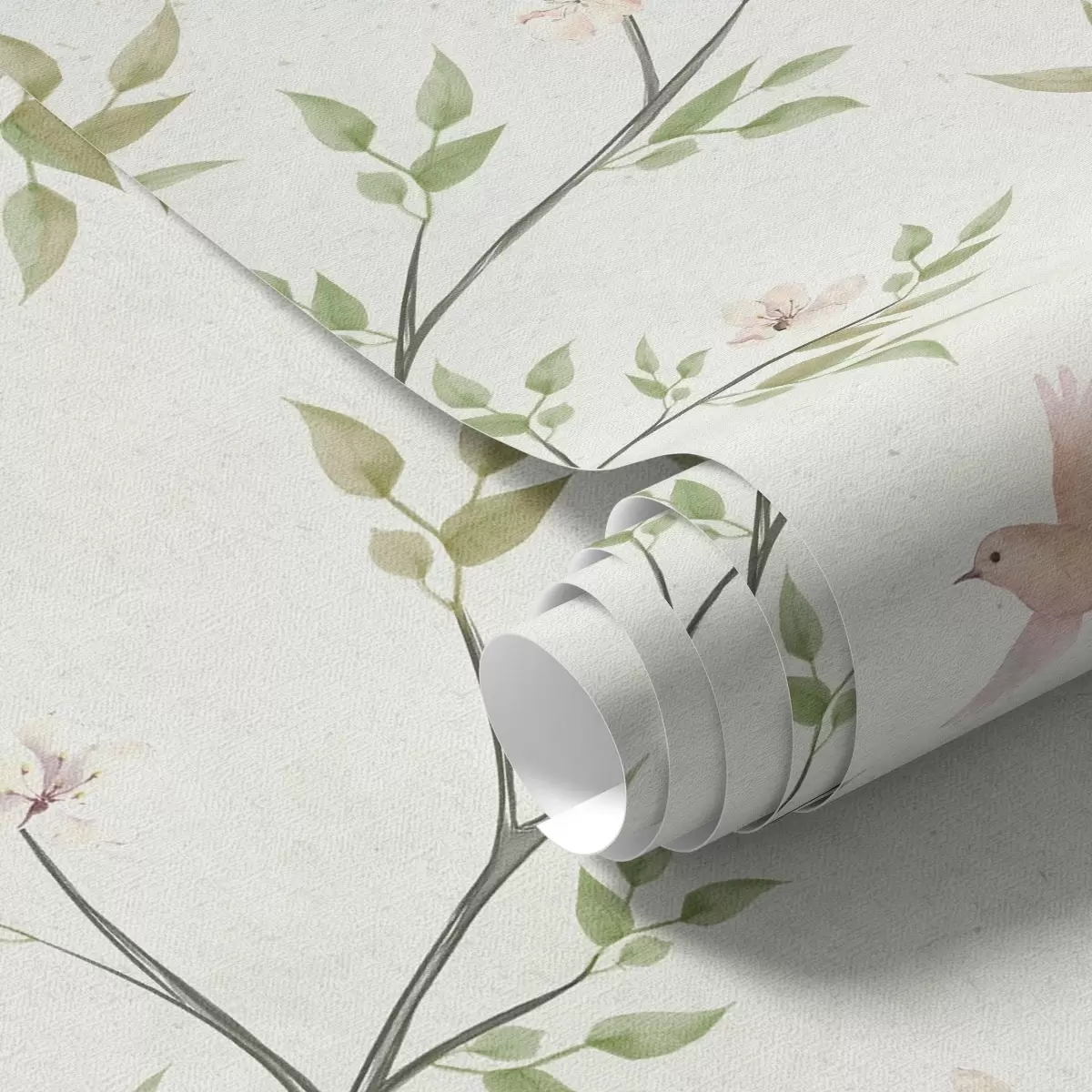 Tapet Akvarellgrenar med löv och fåglar på ljus bakgrund Nr. a00496