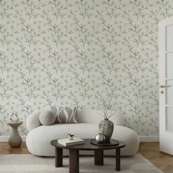 Tapet Akvarellgrenar med löv och fåglar på ljus bakgrund Nr. a00496