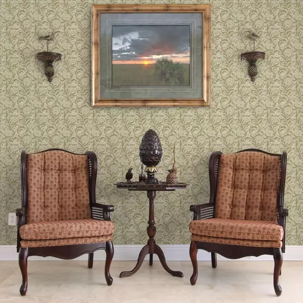 Tapet Vintage ornament med snirklar och blommor, beige och olivgrön Nr. a00574