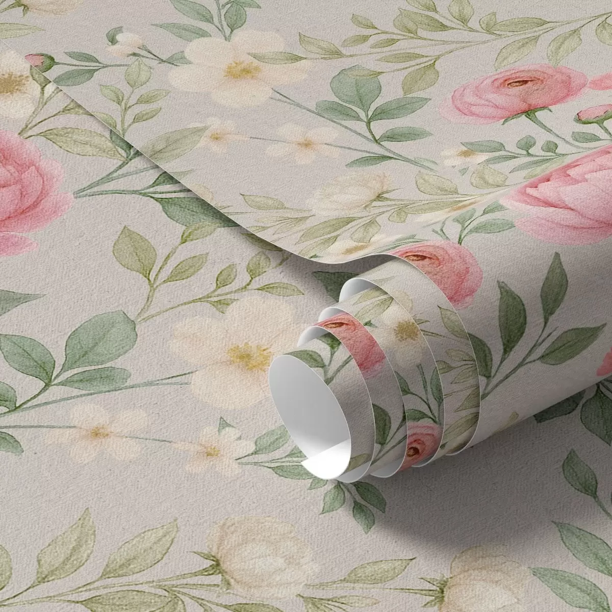 Tapet Akvarellmålade pioner och vita blommor på gråbeige bakgrund Nr. a00592