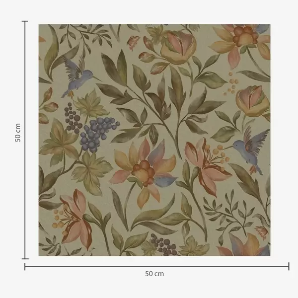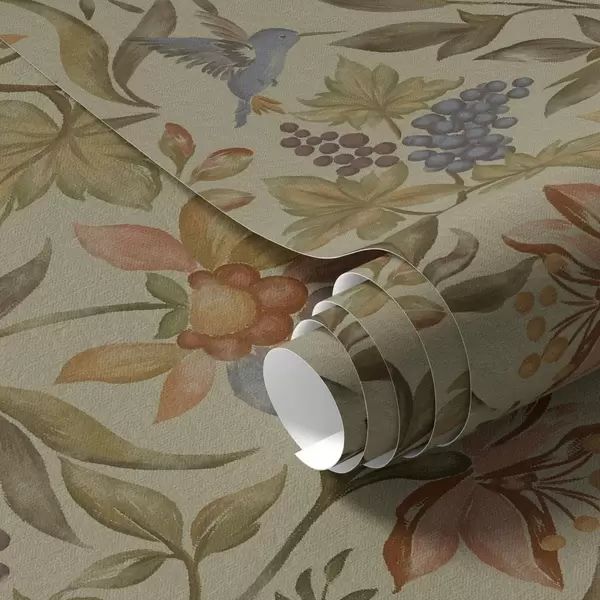 Tapet Vintage blommor och fåglar med druvor på en olivgrön bakgrund Nr. a00594