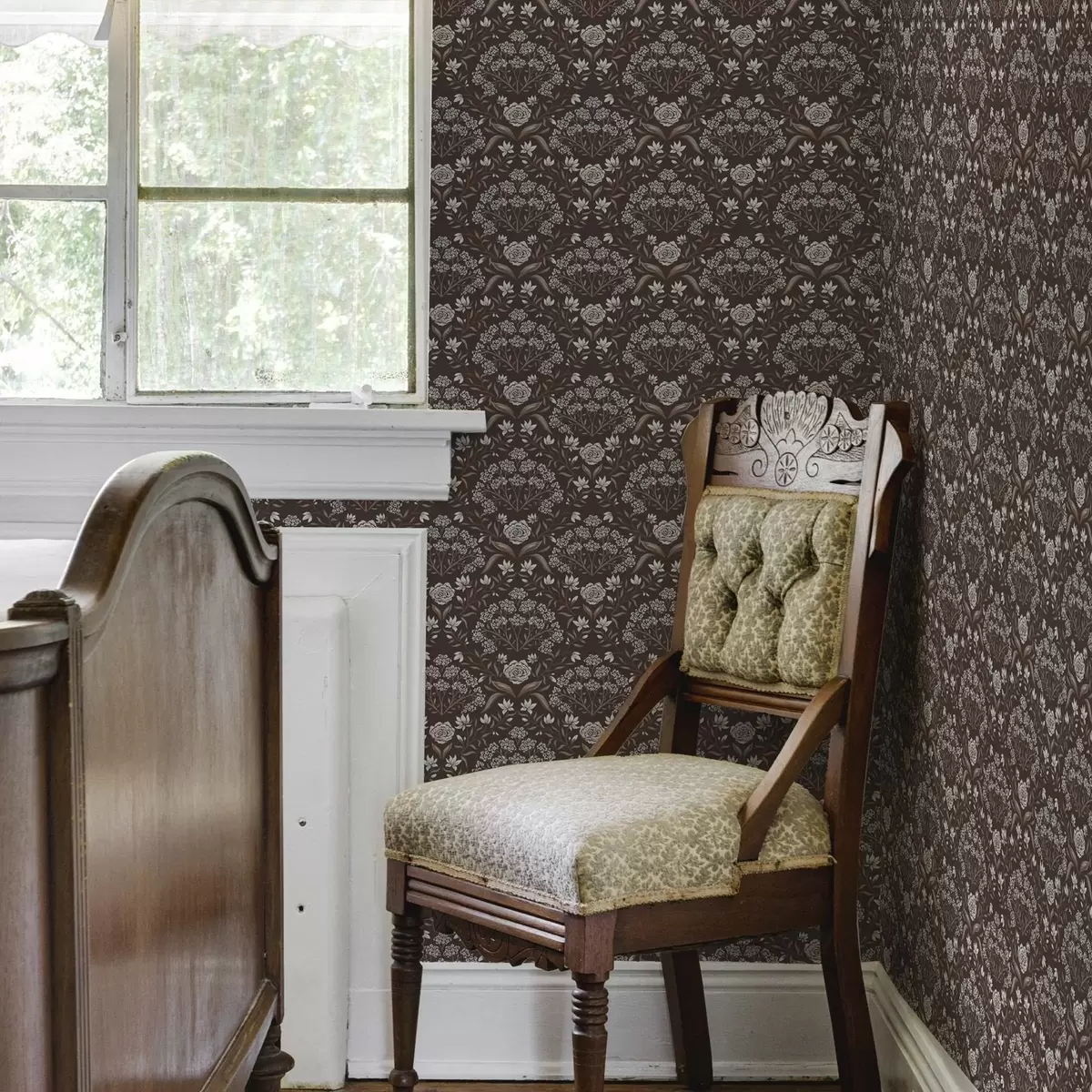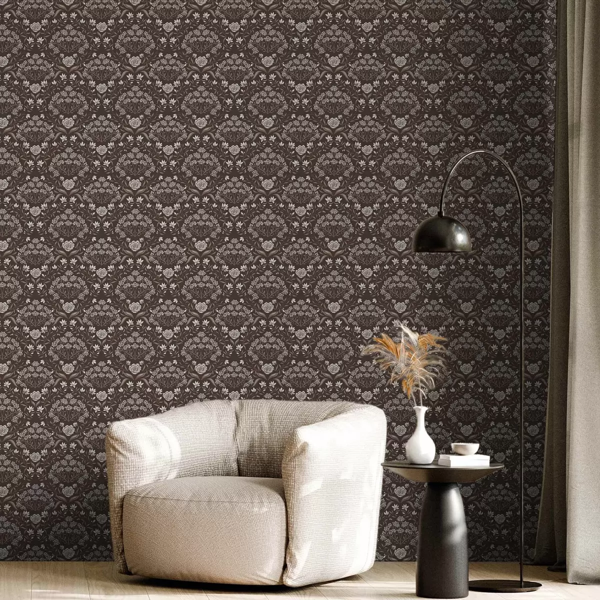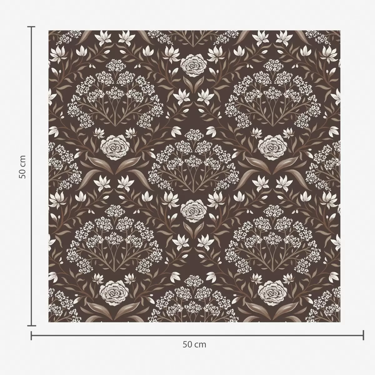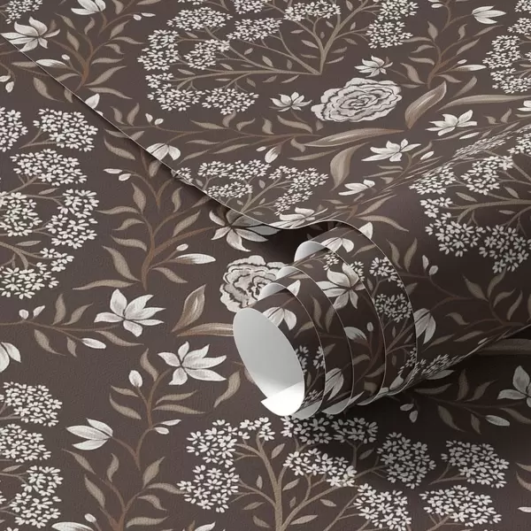 Tapet Mörk chokladdamast med pioner och snödroppar Nr. a00603v2
