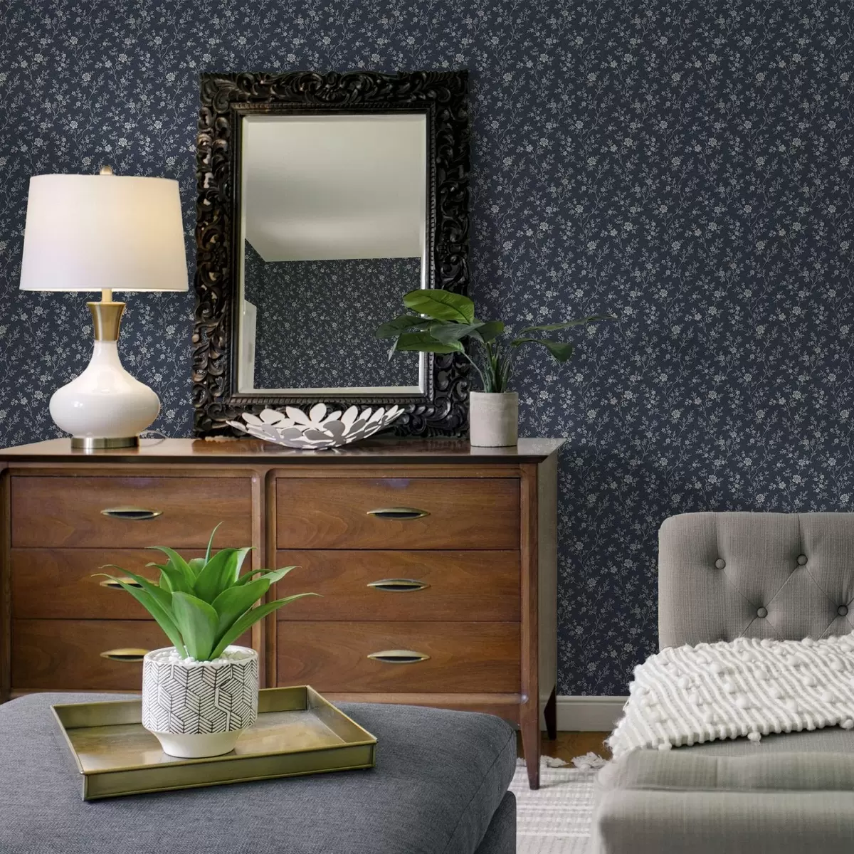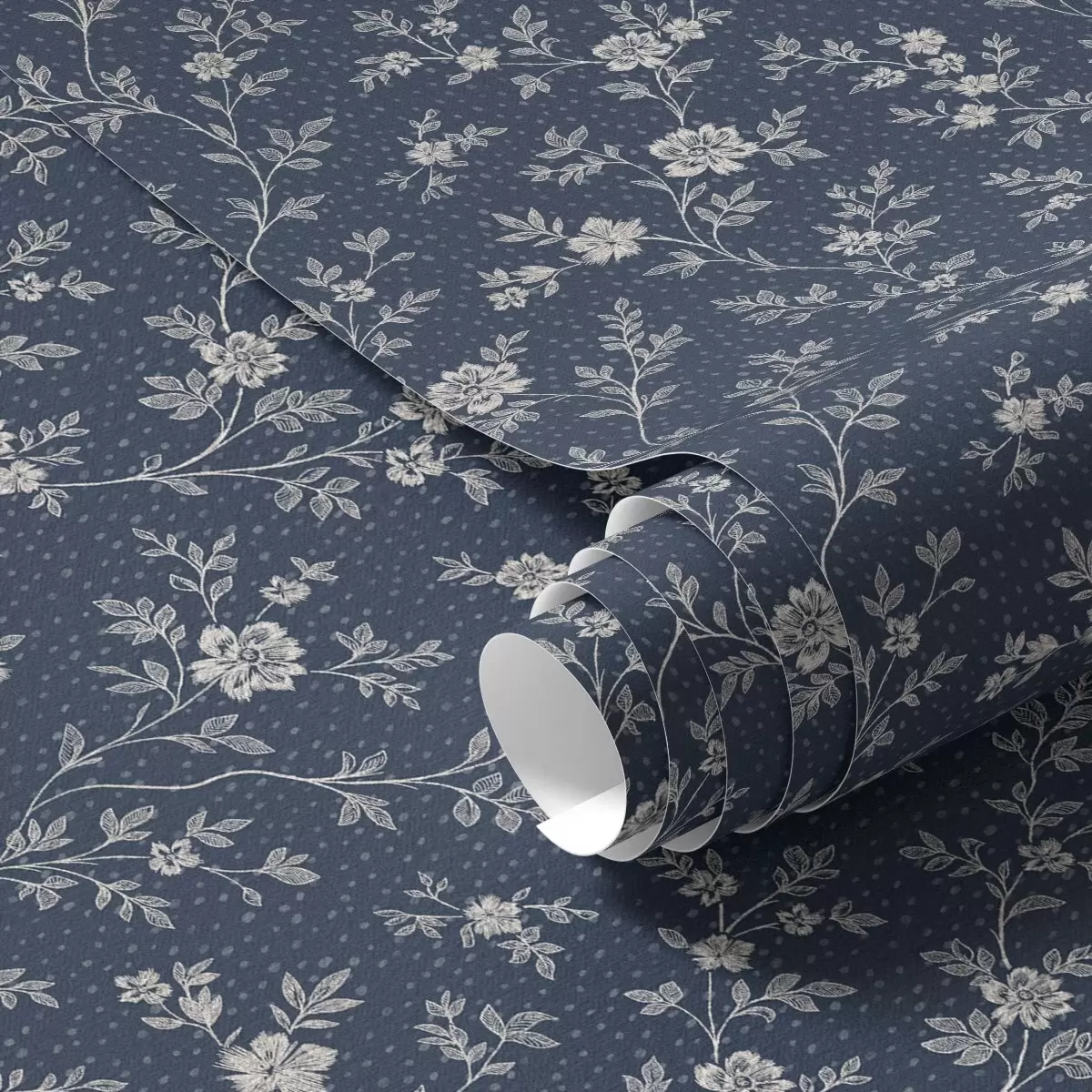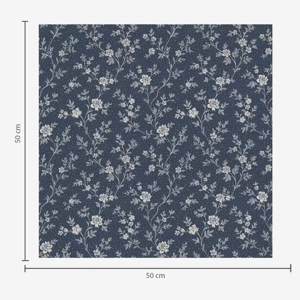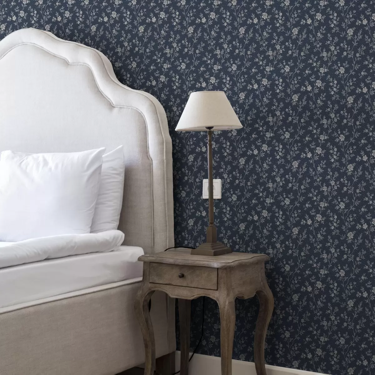 Tapet Mörk marinblå bakgrund med tunna beige grenar och blommor Nr. a00612