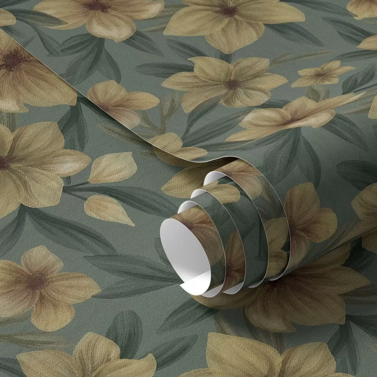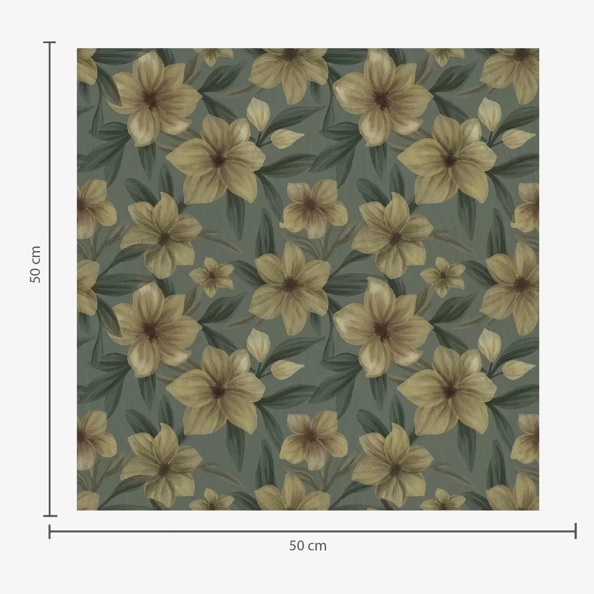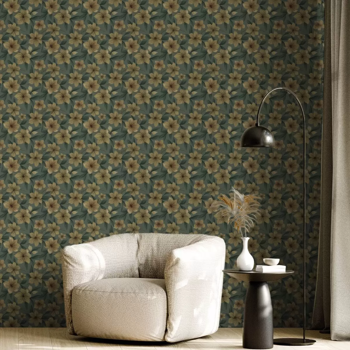 Tapet Ockrafärgade blommor på en djupgrön bakgrund, tätt mönster Nr. a00628