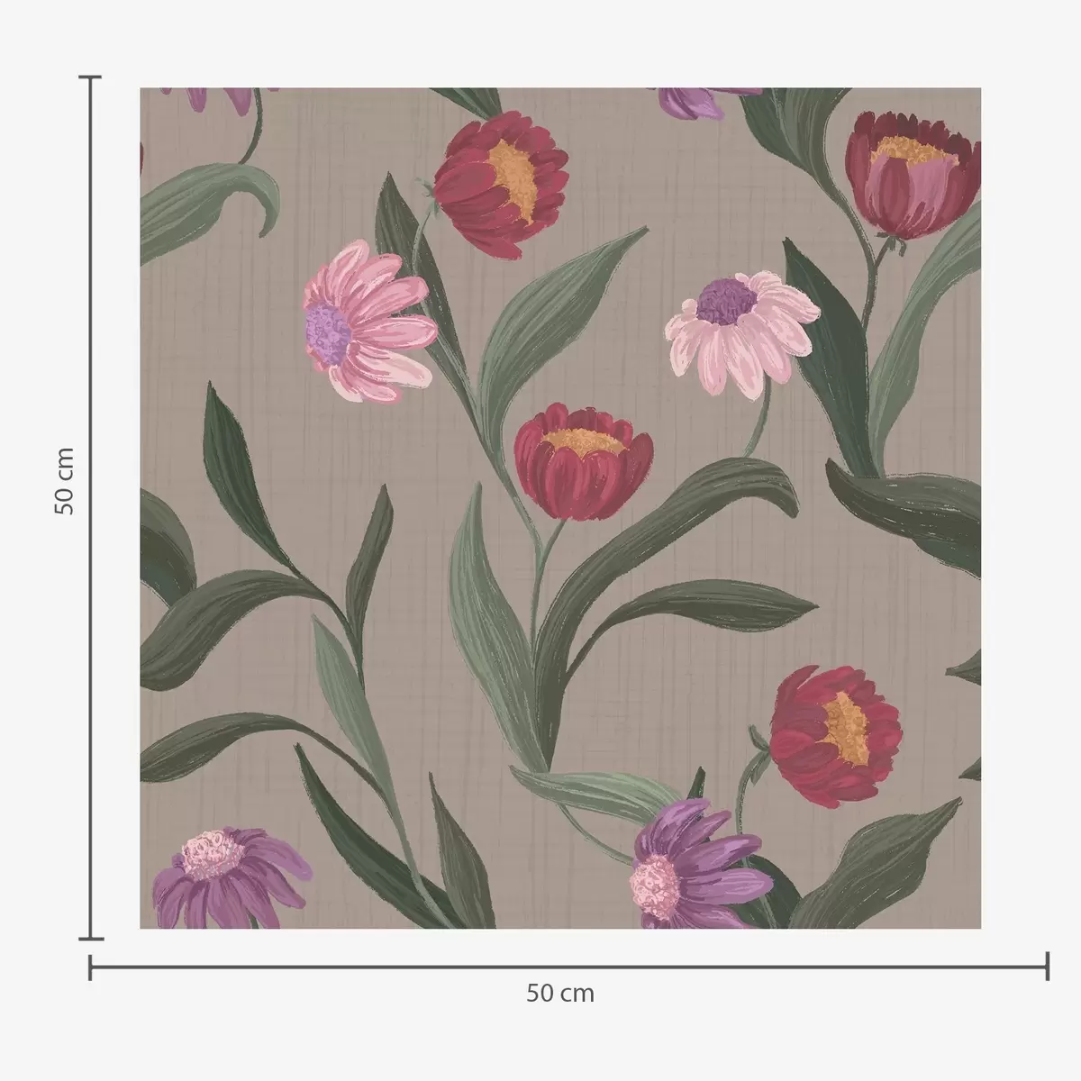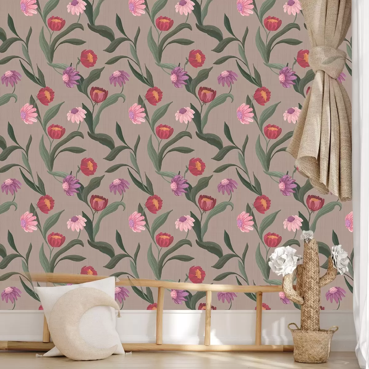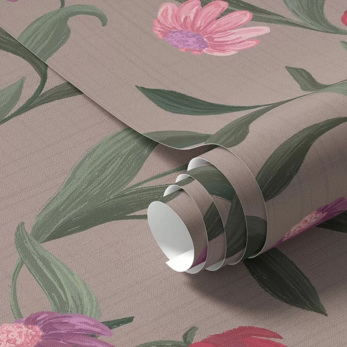 Tapet Rosa-röda blommor på en gråbrun bakgrund, långa stjälkar Nr. a00631v2