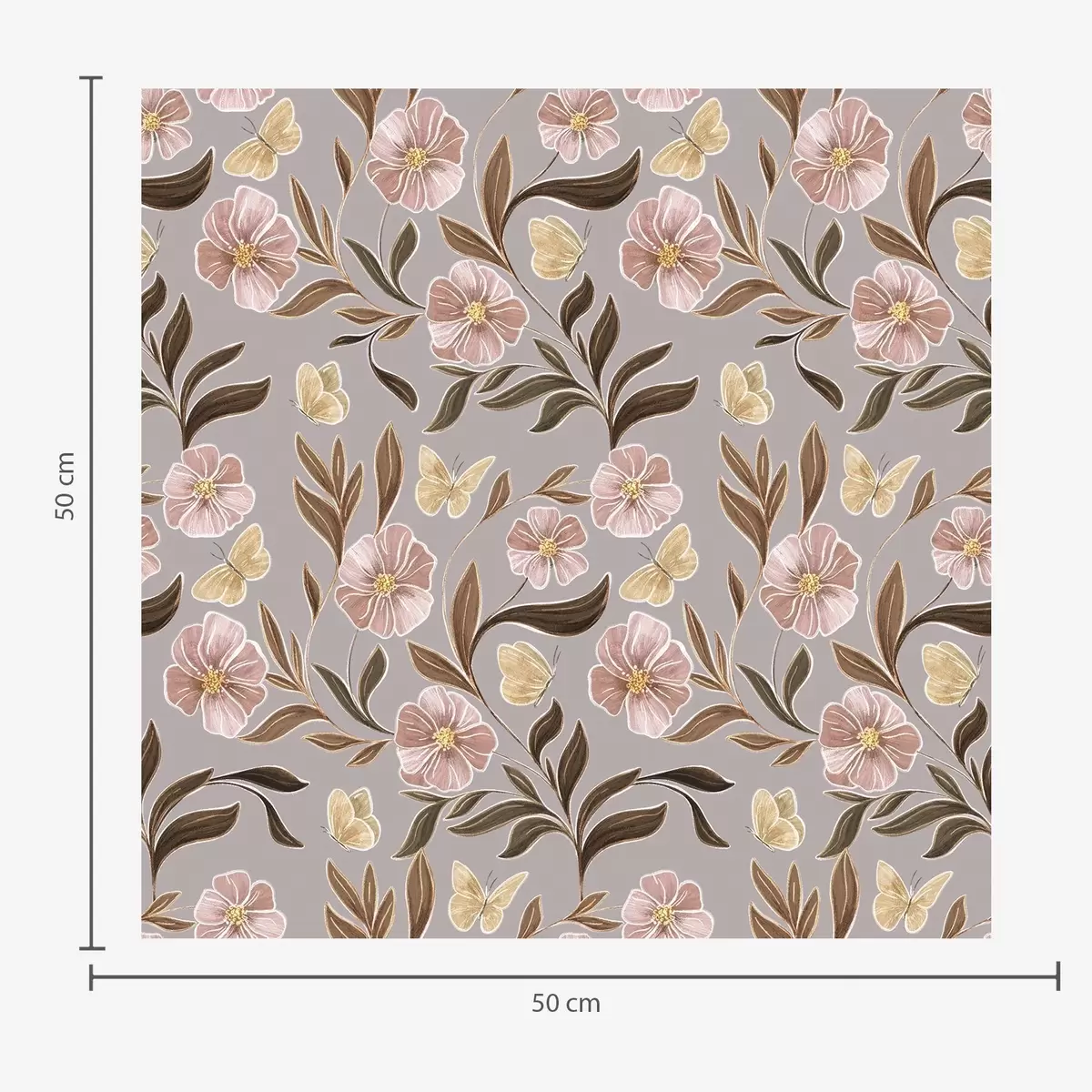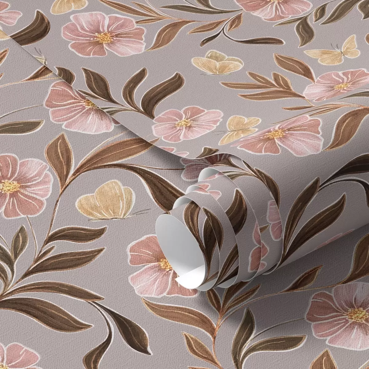 Tapet Rosa blommor och fjärilar på en gråbeige bakgrund Nr. a00633
