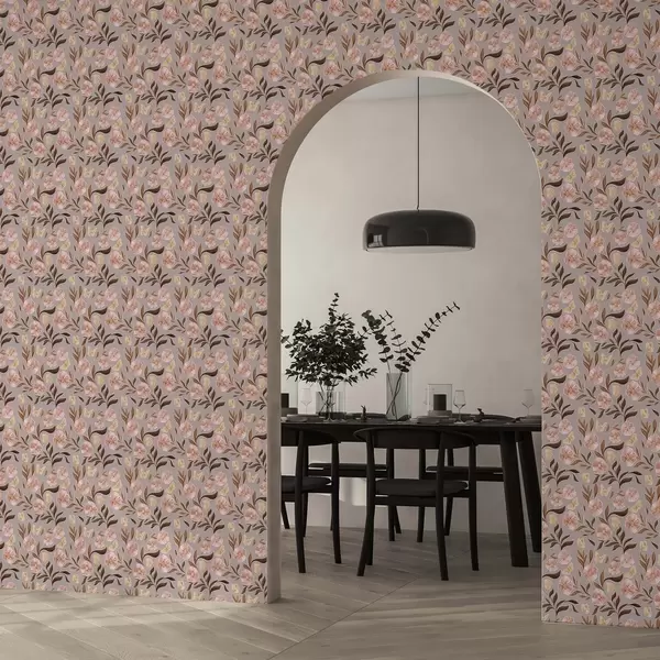 Tapet Rosa blommor och fjärilar på en gråbeige bakgrund Nr. a00633