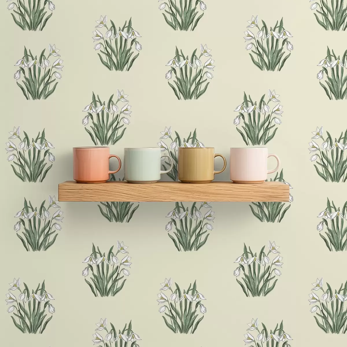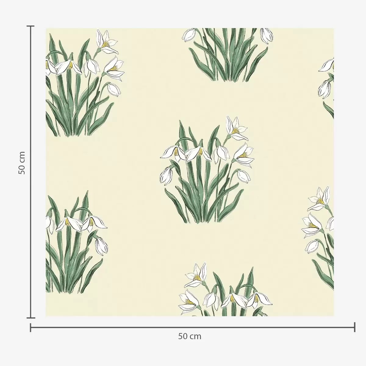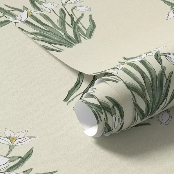 Tapet Snödroppar med gröna blad på krämvit bakgrund Nr. a00651v2