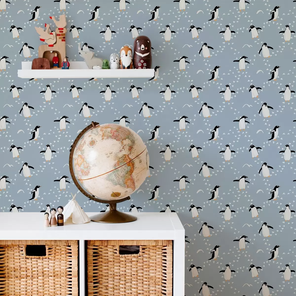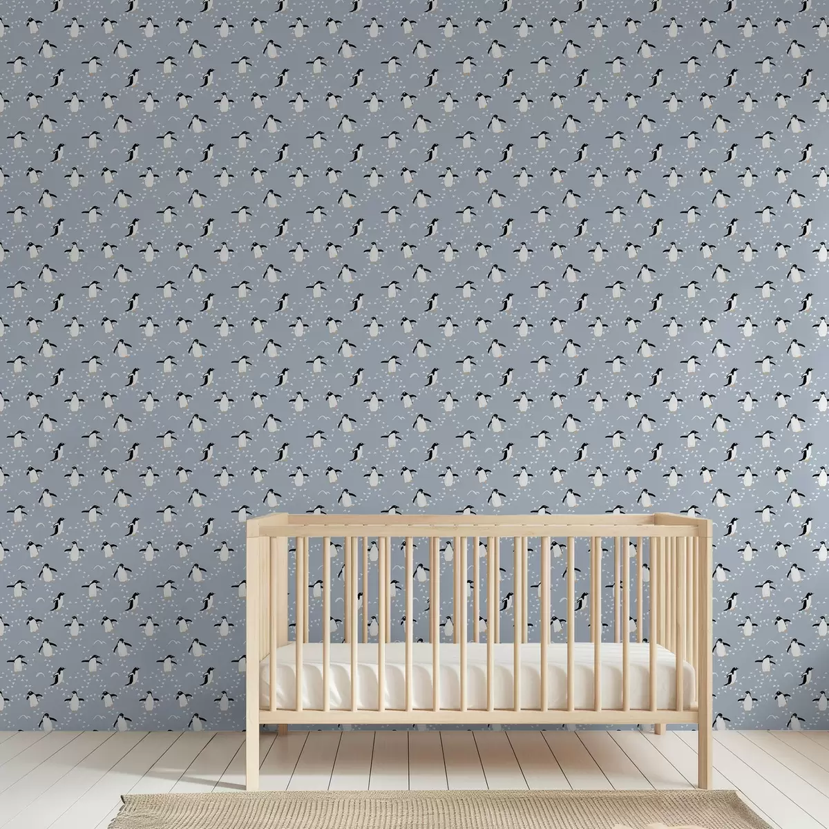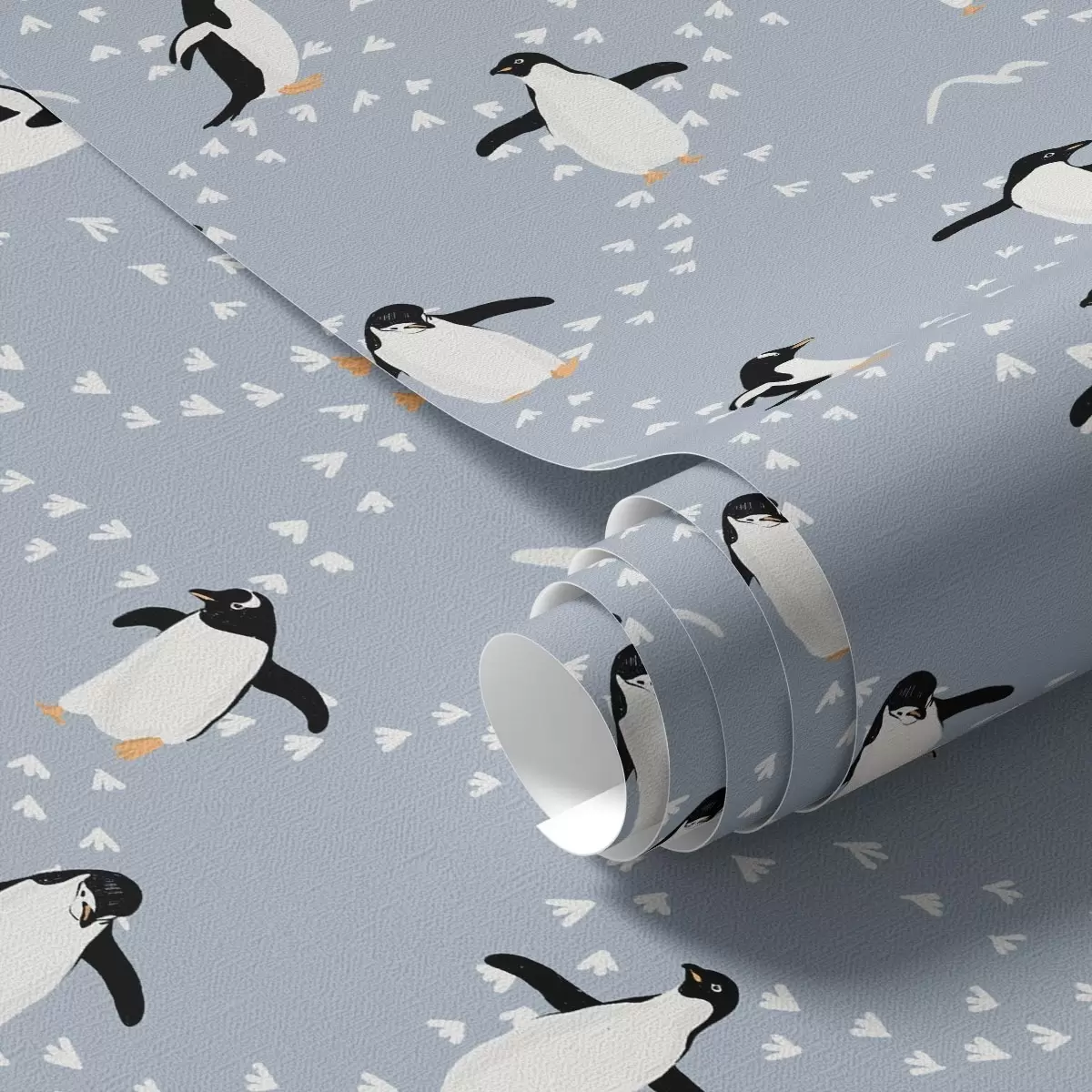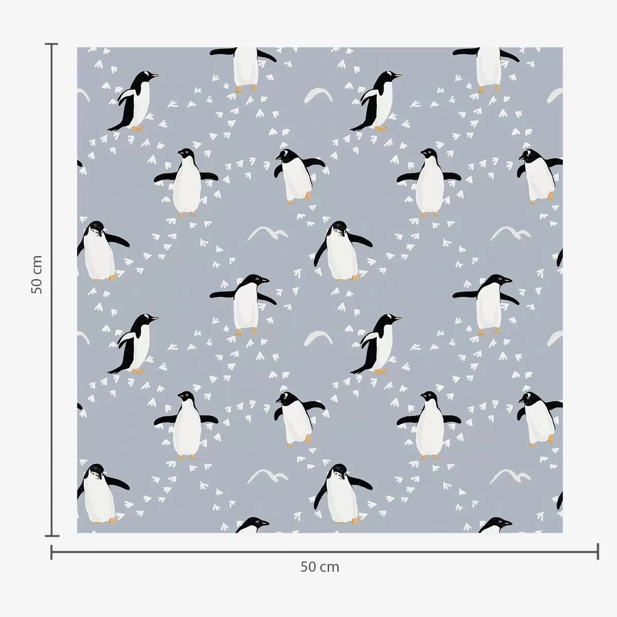 Tapet Pingviner på gråblått med fotavtryck Nr. a00655