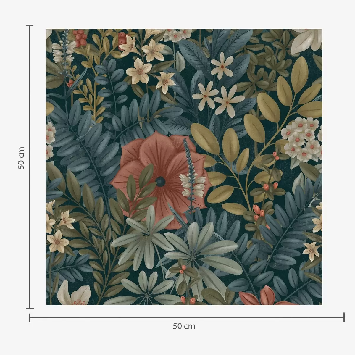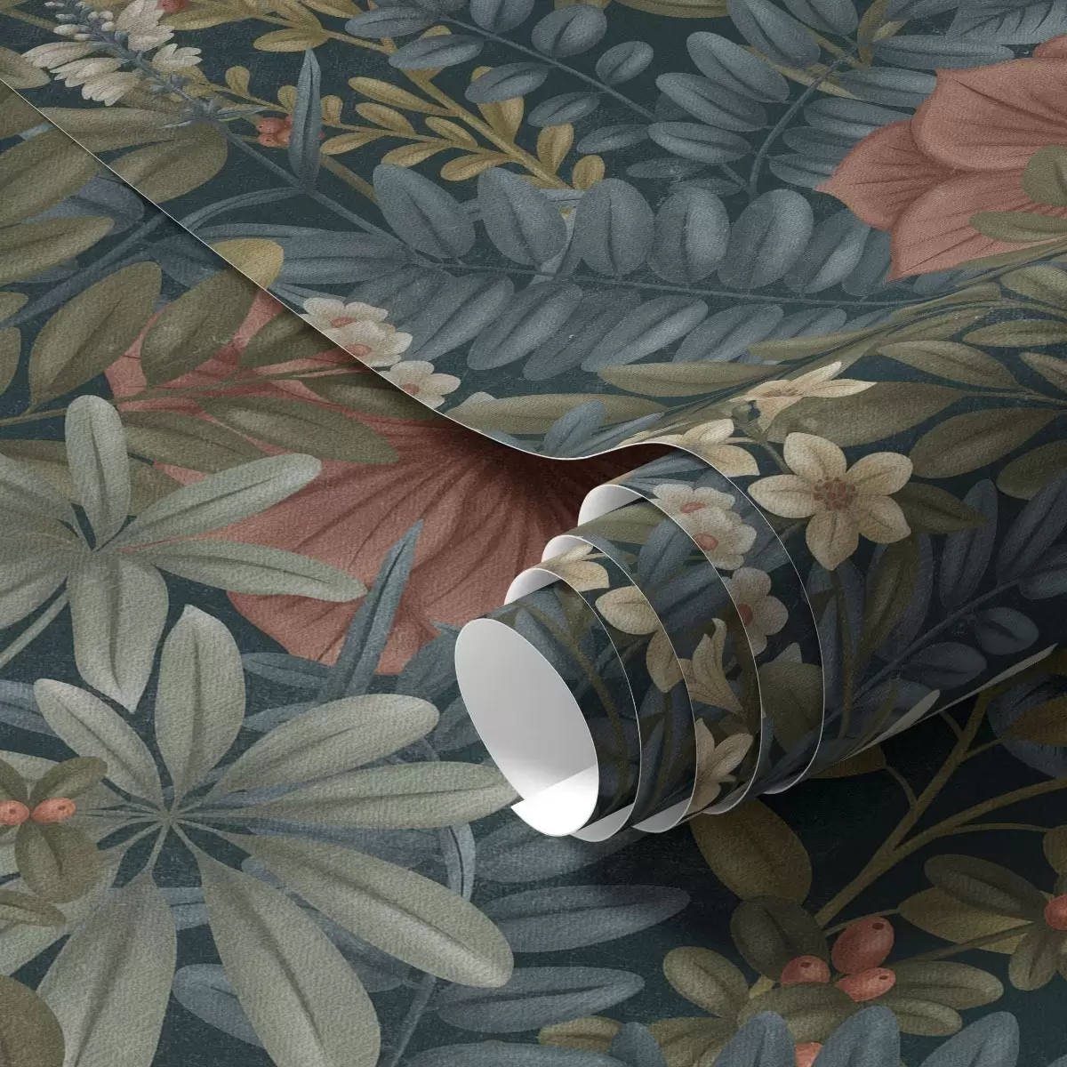 Tapet Mörk bakgrund med täta blommor och blad i varma toner Nr. a00678
