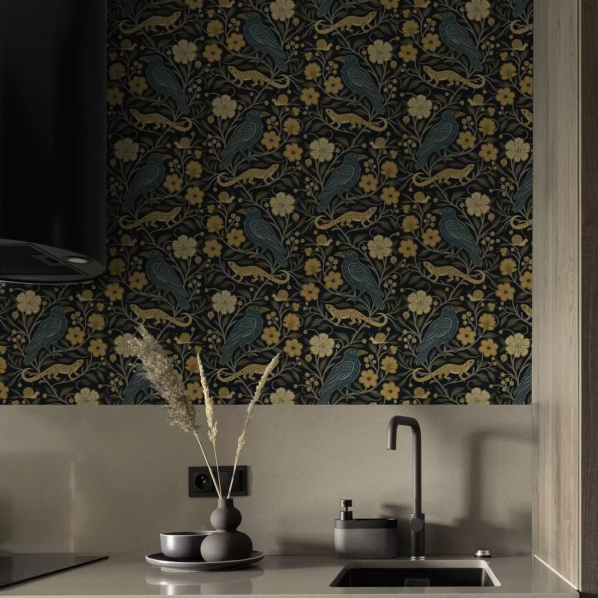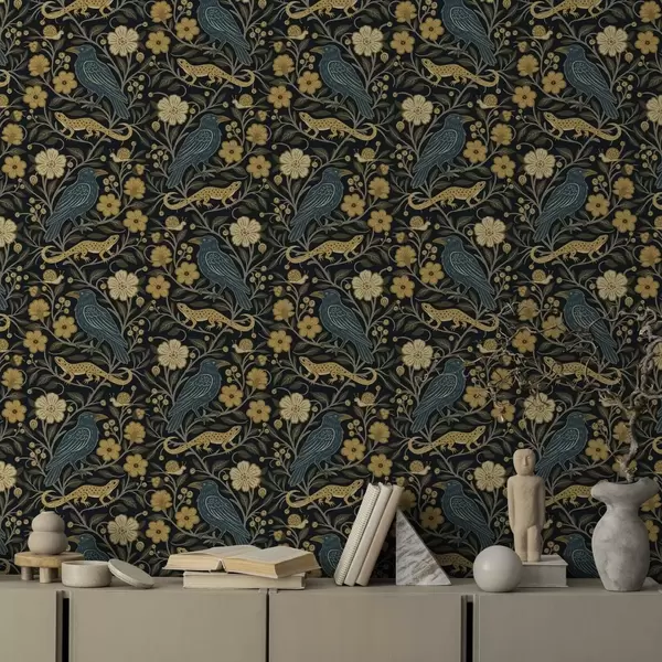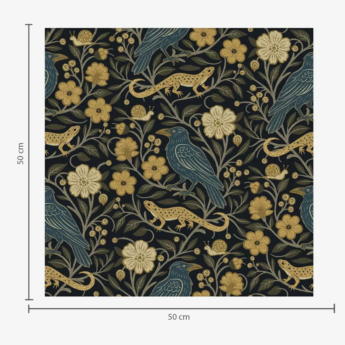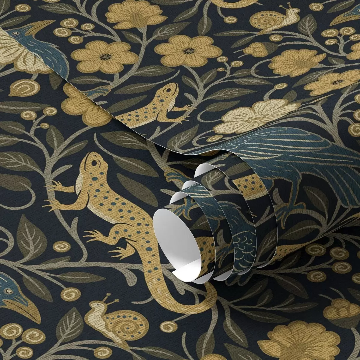 Tapet Fåglar, ödlor och sniglar bland blommor på mörk bakgrund Nr. a00691