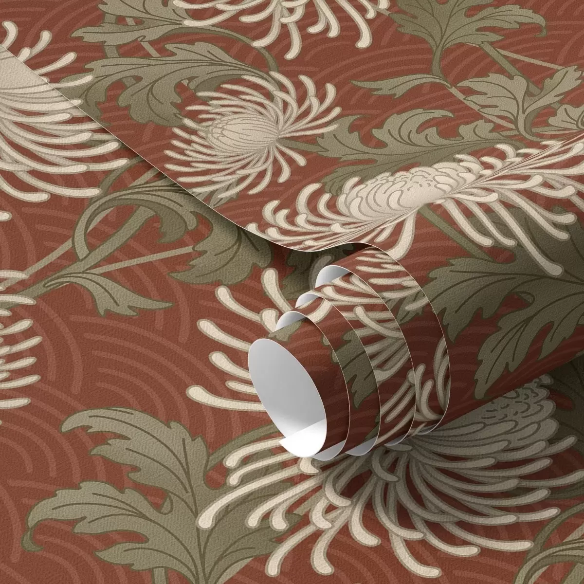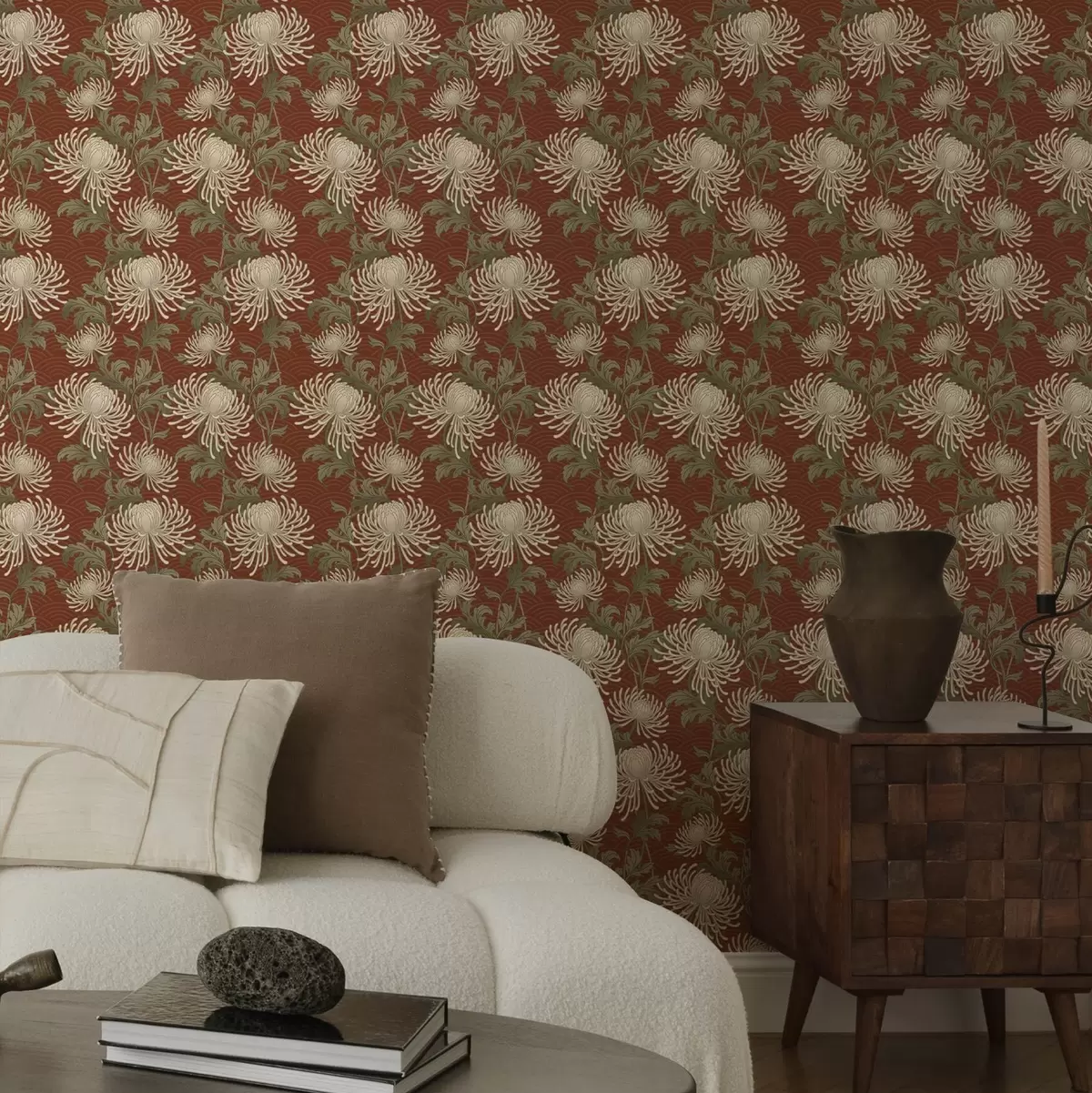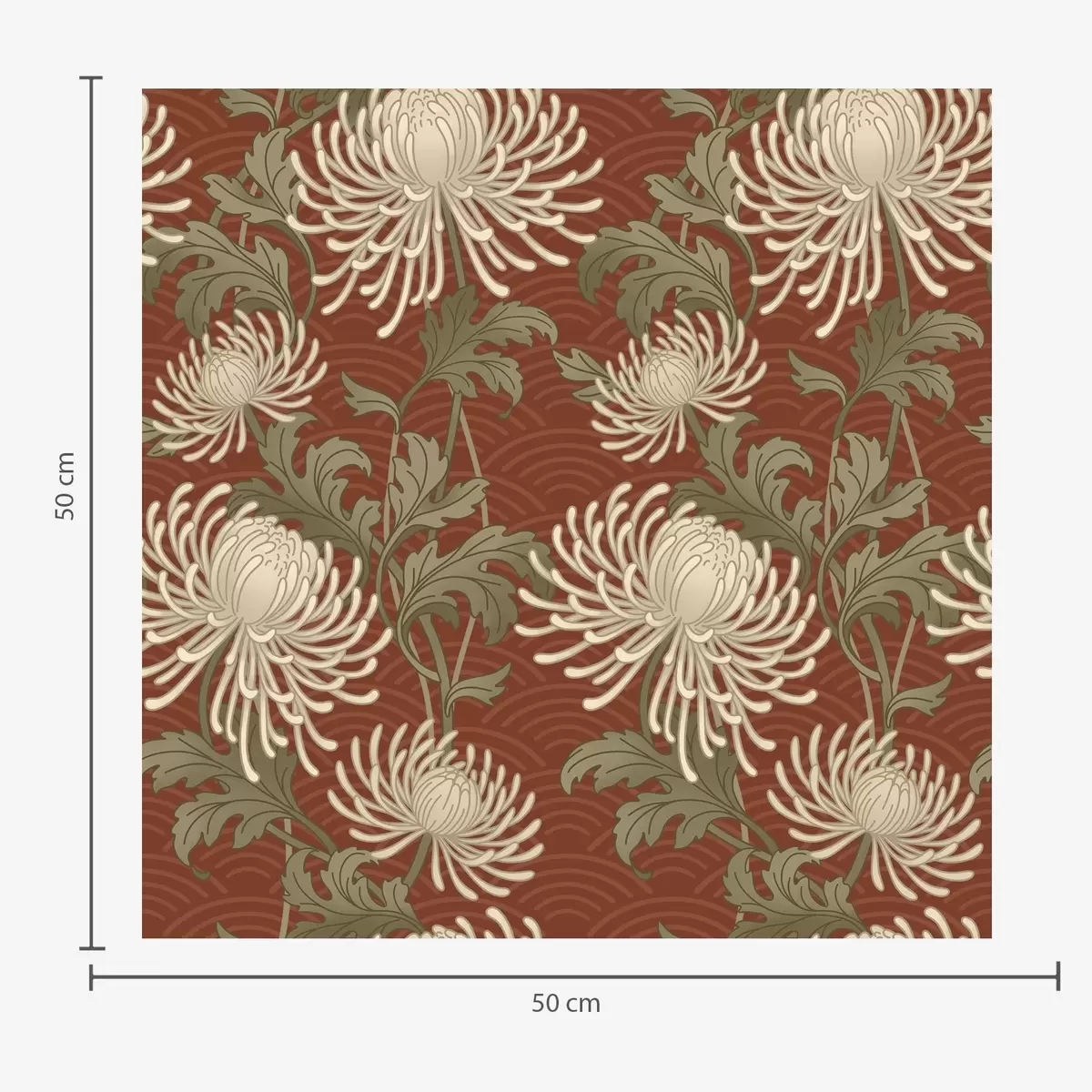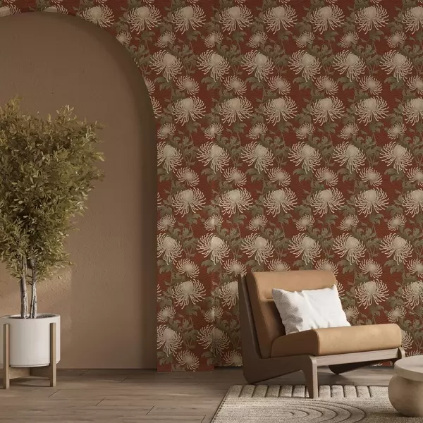 Tapet Krämfärgade krysantemum på terrakottafärgad bakgrund, asiatisk stil Nr. a00693