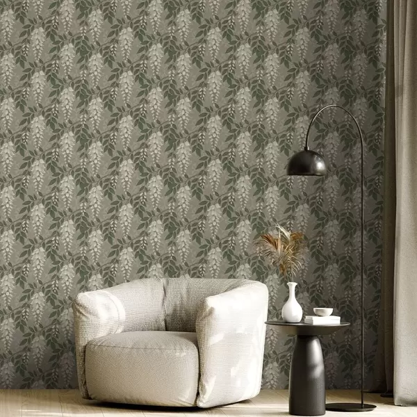 Tapet Ljus blåregn på en grå-olivgrön bakgrund, kaskadformade klasar Nr. a00694