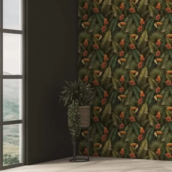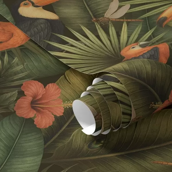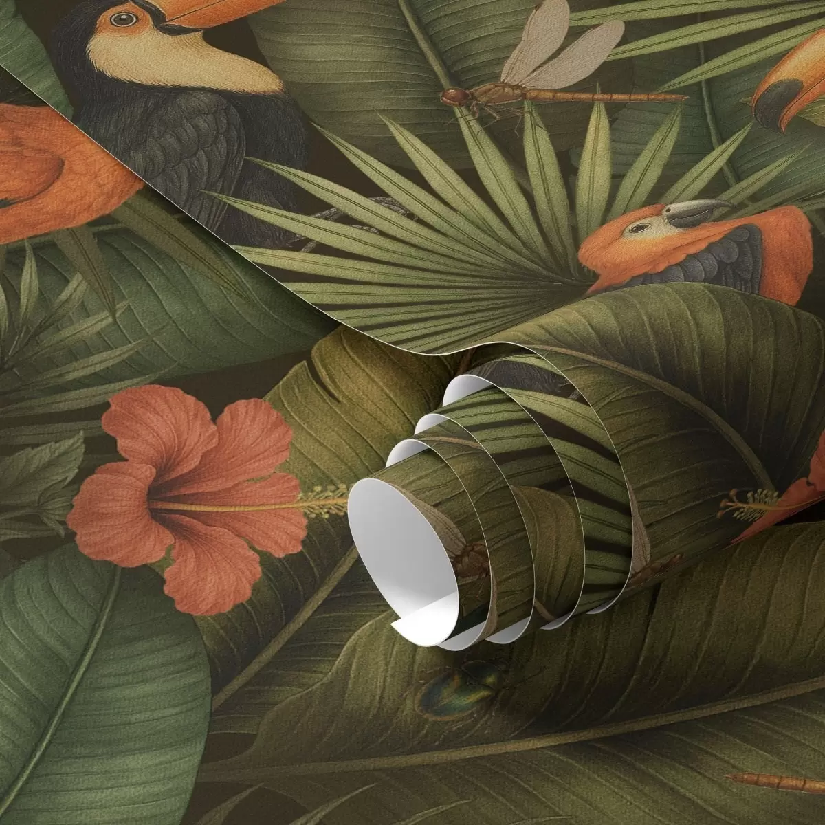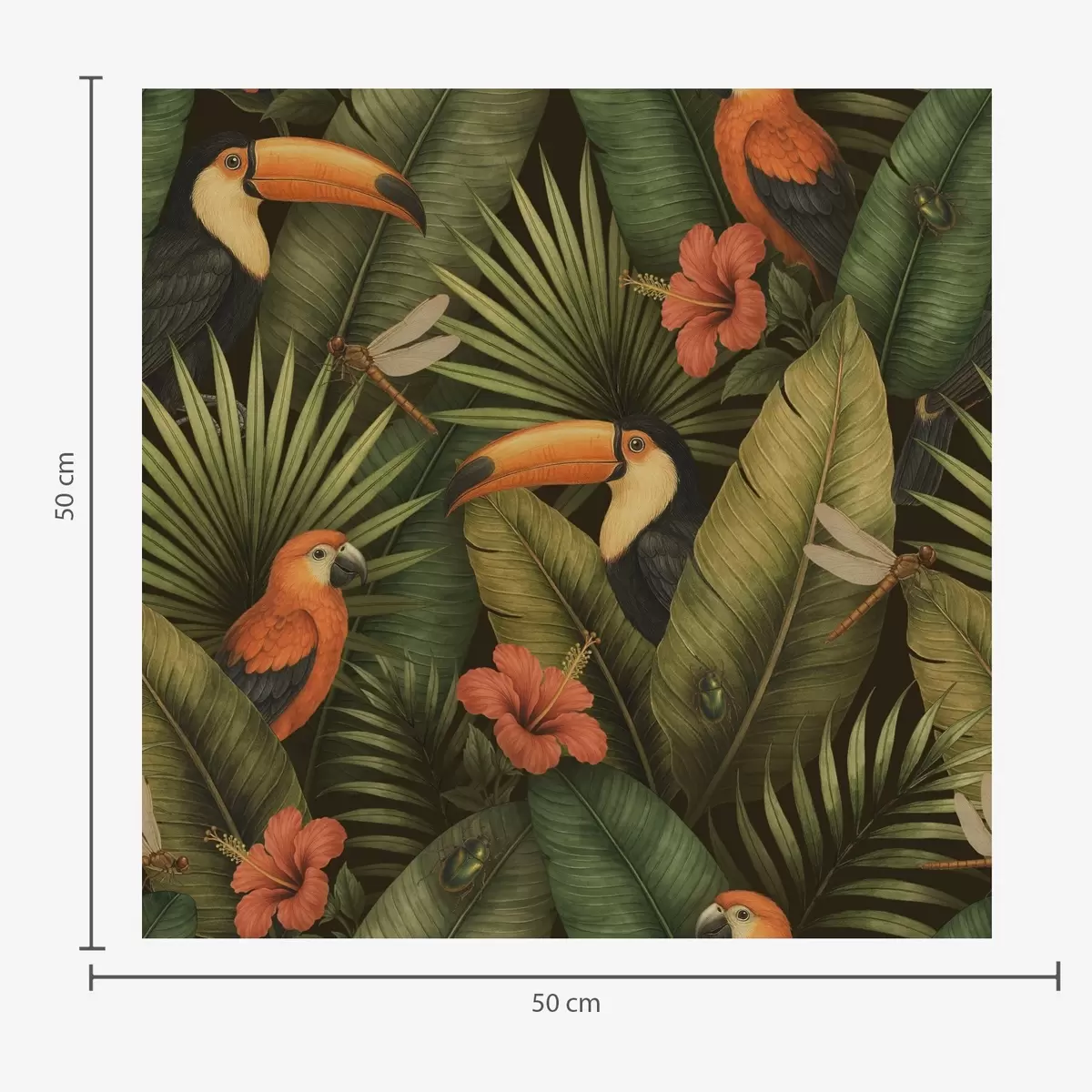 Tapet Tukaner och papegojor bland tropiska bladverk och blommor Nr. a00702