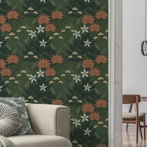 Tapet Stora blommor bland grönt bladverk, dekorativ komposition Nr. a00708