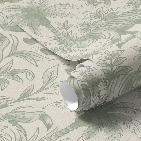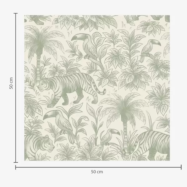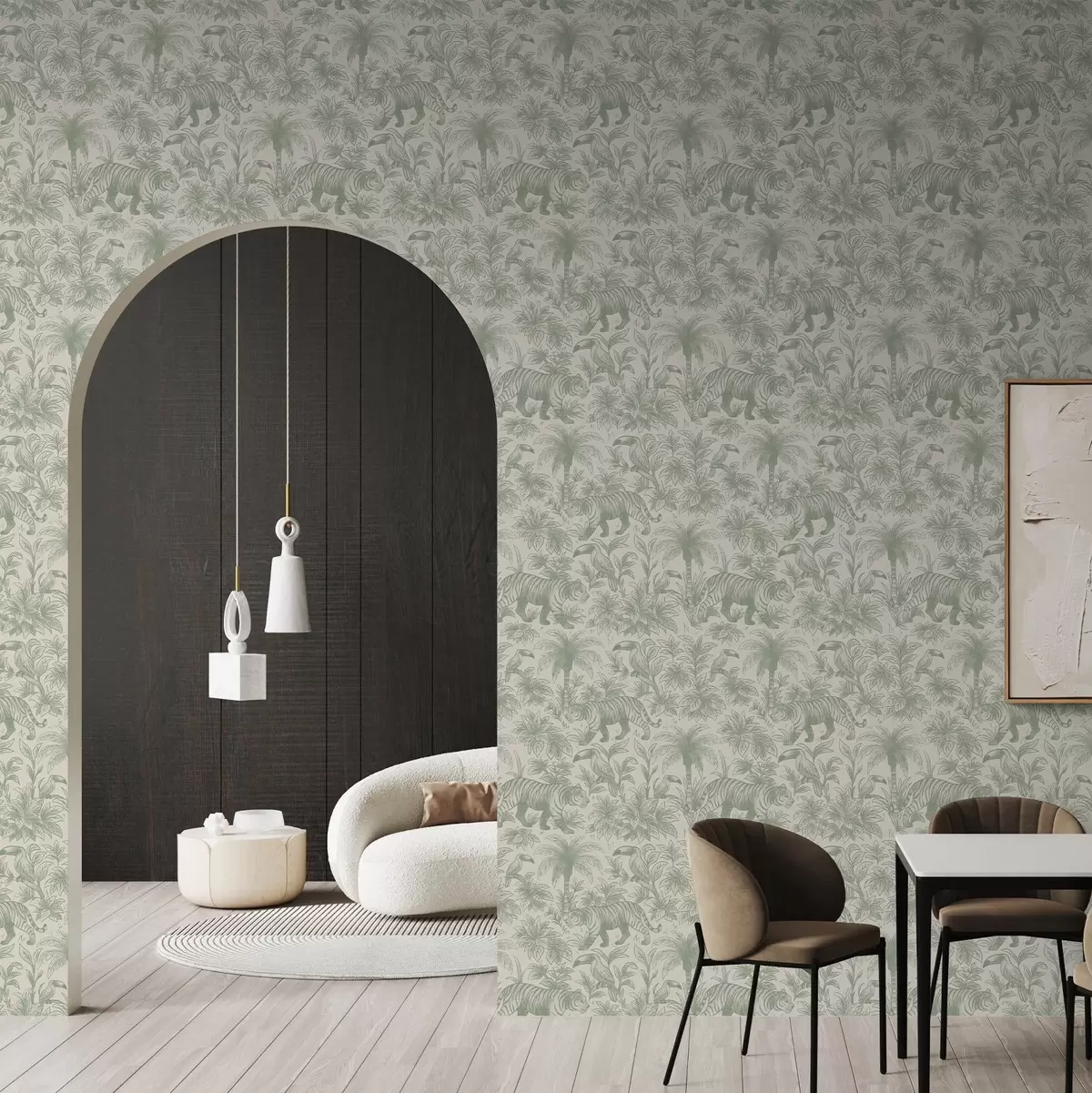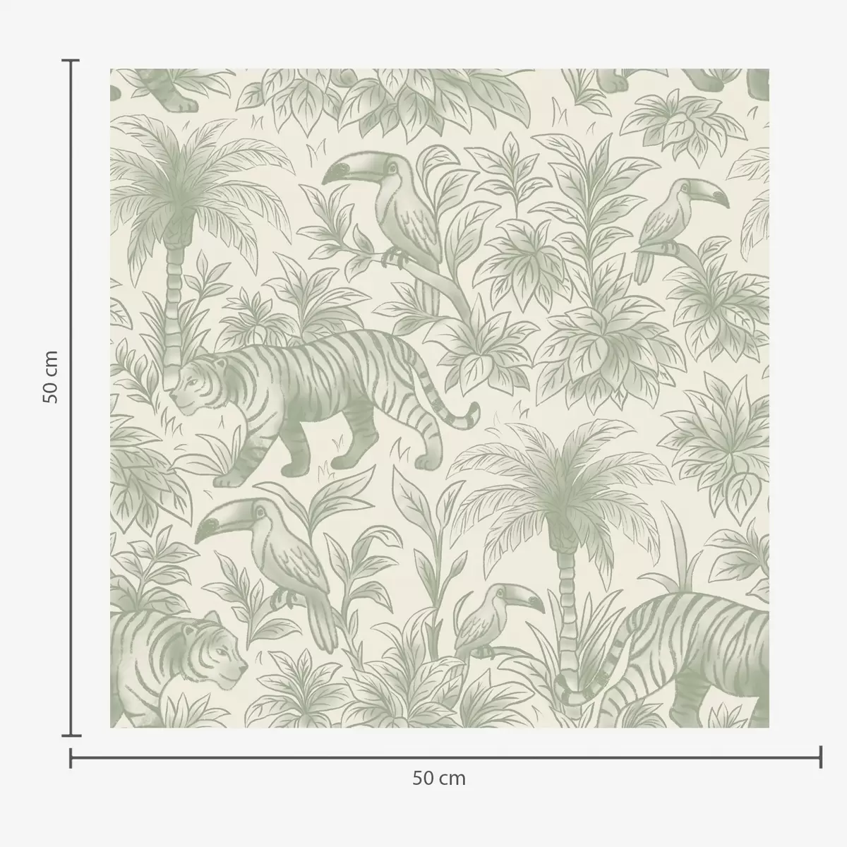 Tapet Tigrar och tropiska fåglar bland palmer på en ljus bakgrund Nr. a00711