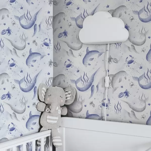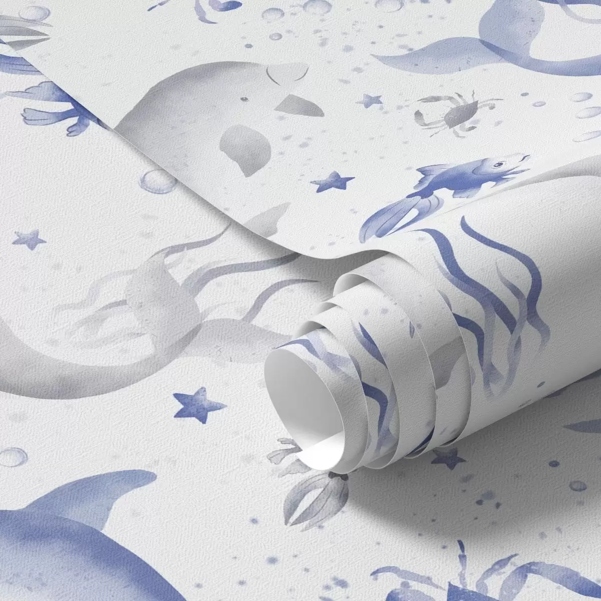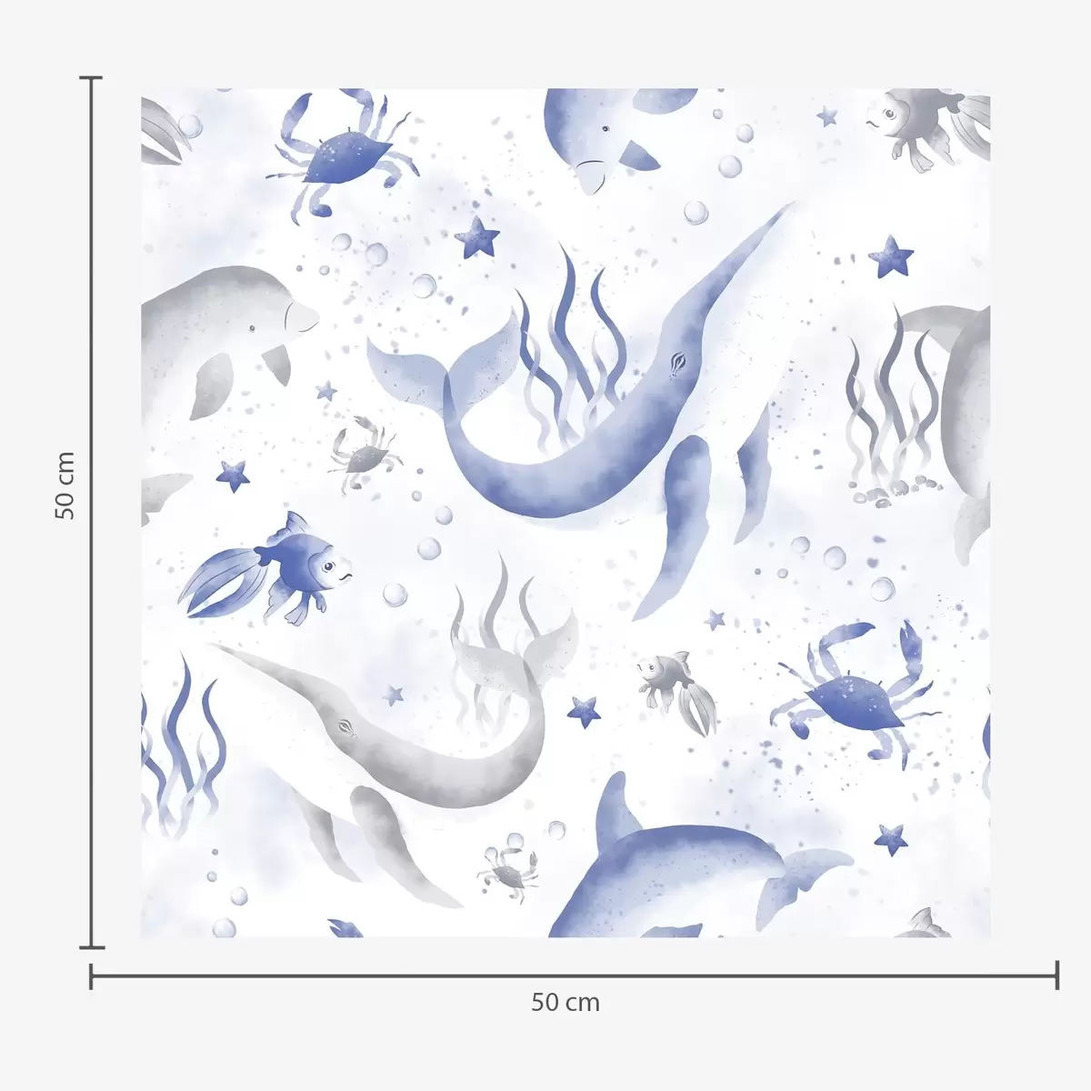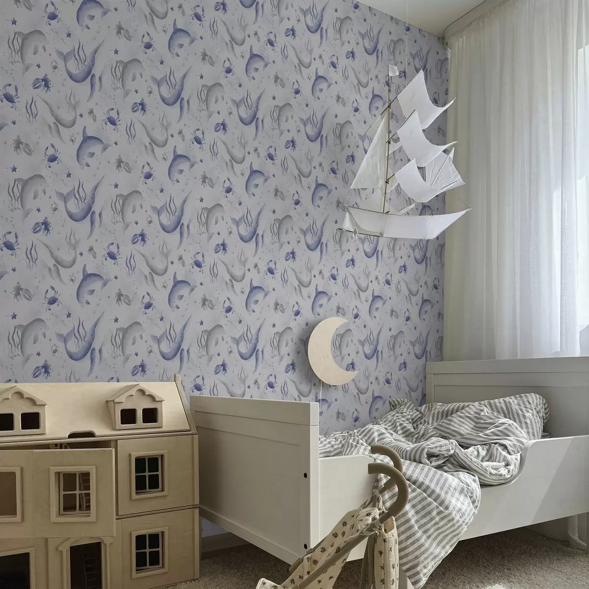 Tapet Havssvalar och delfiner i blå toner på vit bakgrund Nr. a00720v1