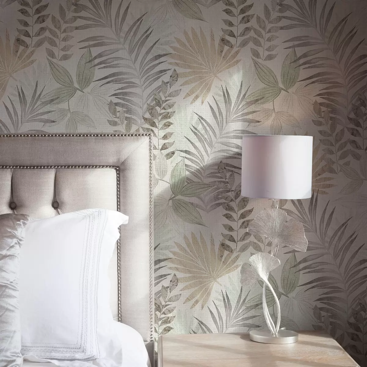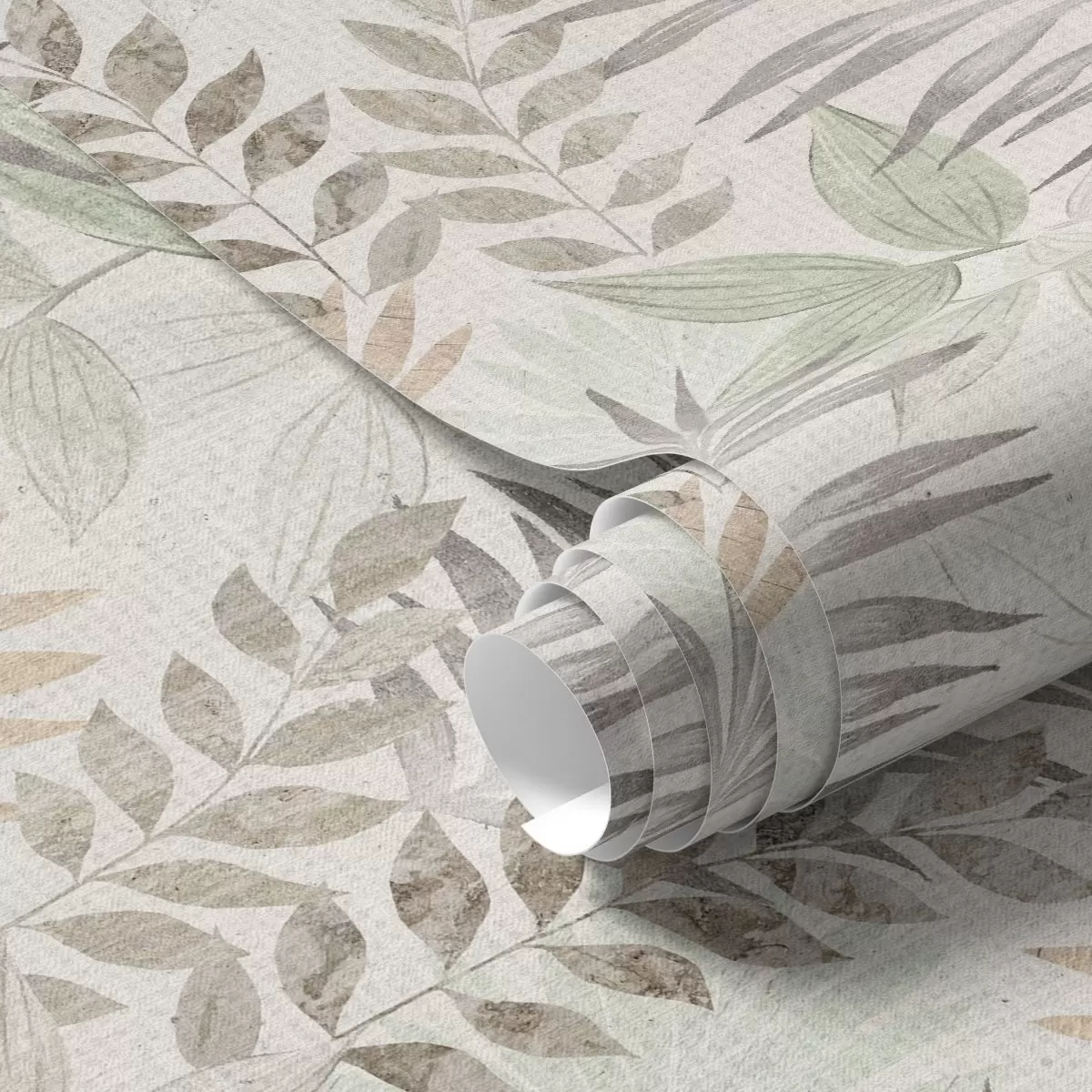 Tapet Pastellfärgade tropiska blad på ljus bakgrund, subtil struktur Nr. a00725