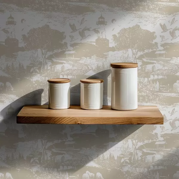 Tapet Scene med fyr, träd och hus i sienna Nr. a00739