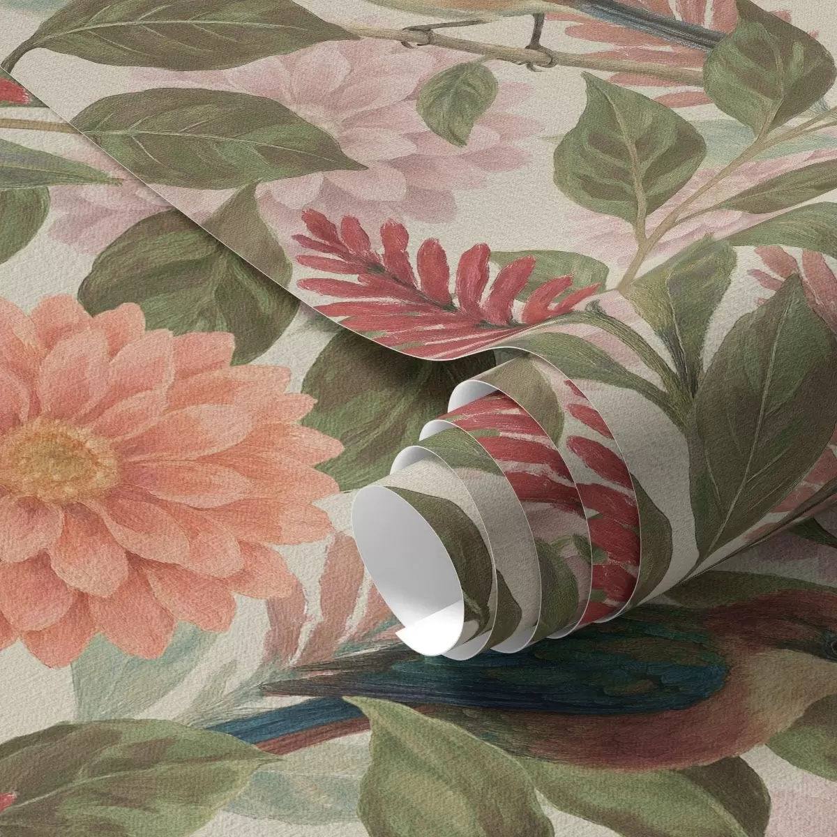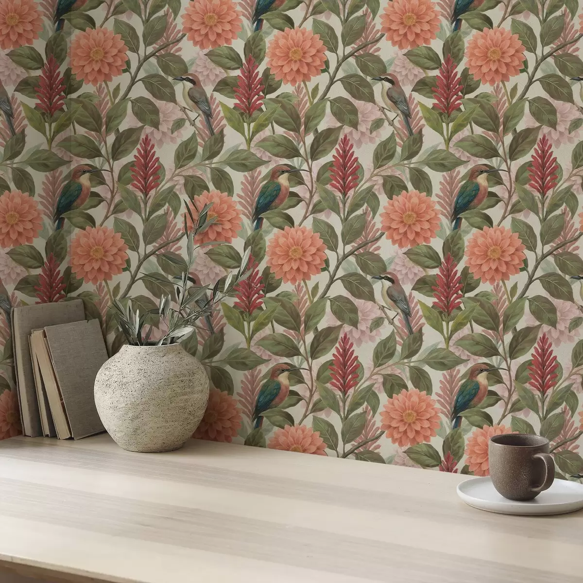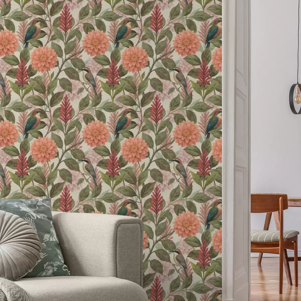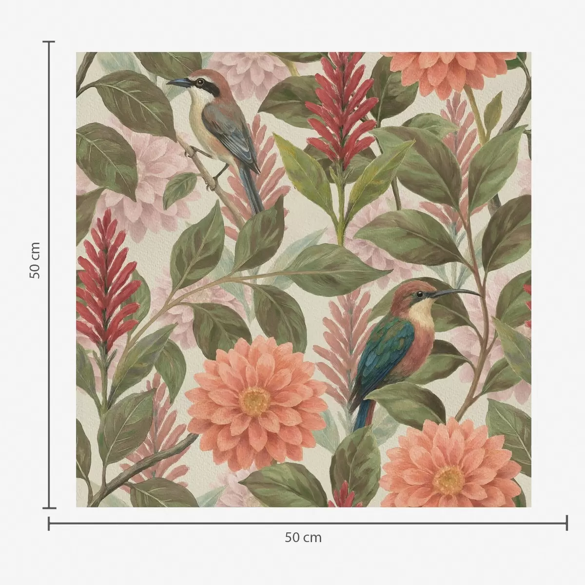 Tapet Fåglar bland blommor och löv i varma toner Nr. a00753