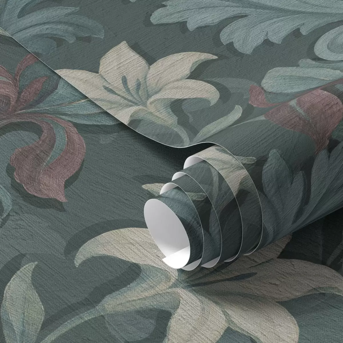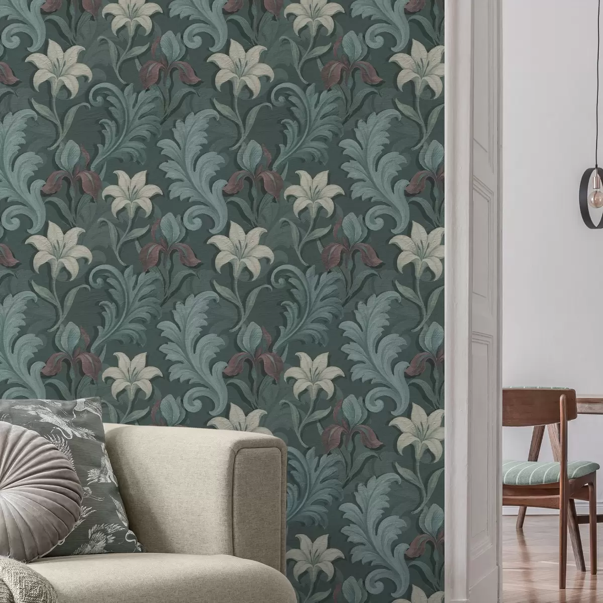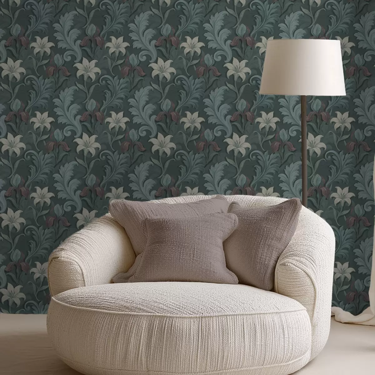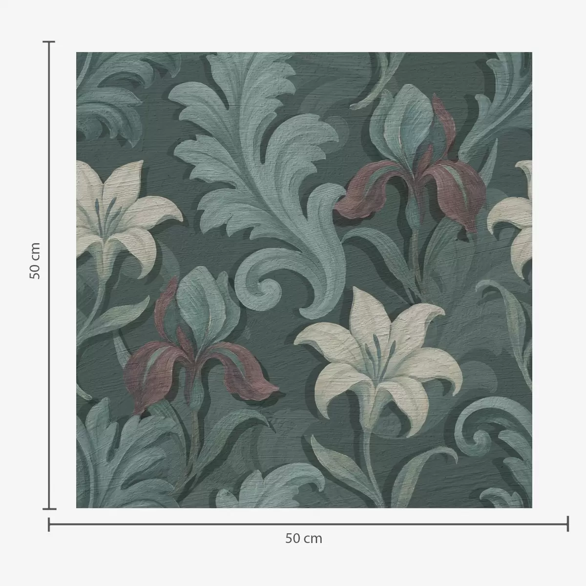 Tapet Mörkgrön bakgrund med irisar och dekorativa blad Nr. a00755