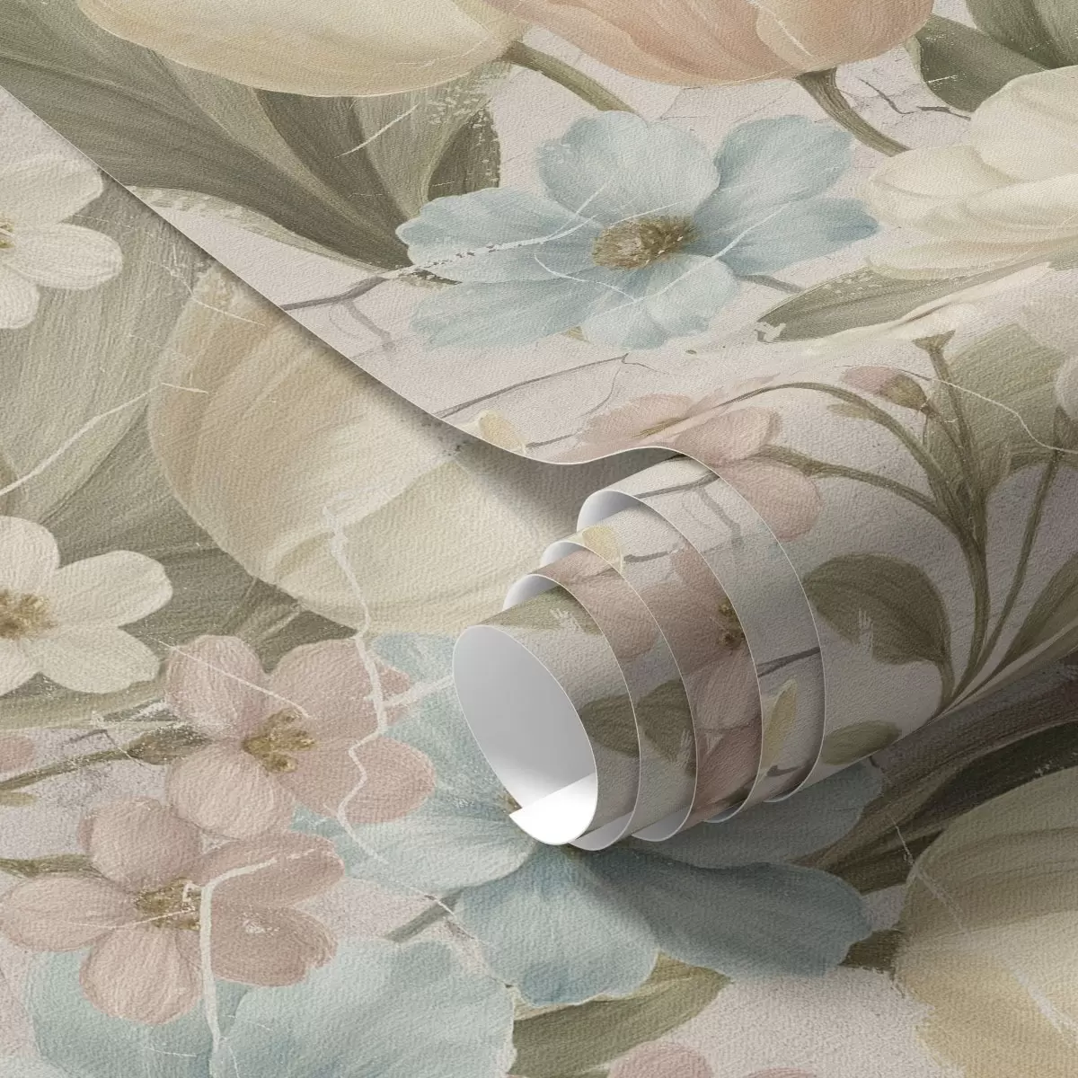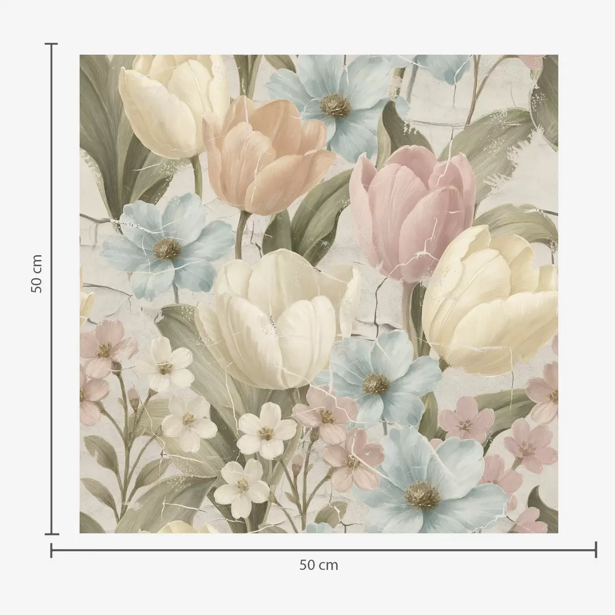 Tapet Pastellfärgade tulpaner och blommor på ljus sprucken bakgrund Nr. a00756