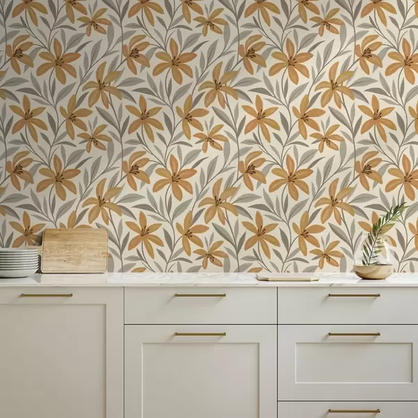 Tapet Gula liljor och grågröna blad på ljus bakgrund Nr. a00757